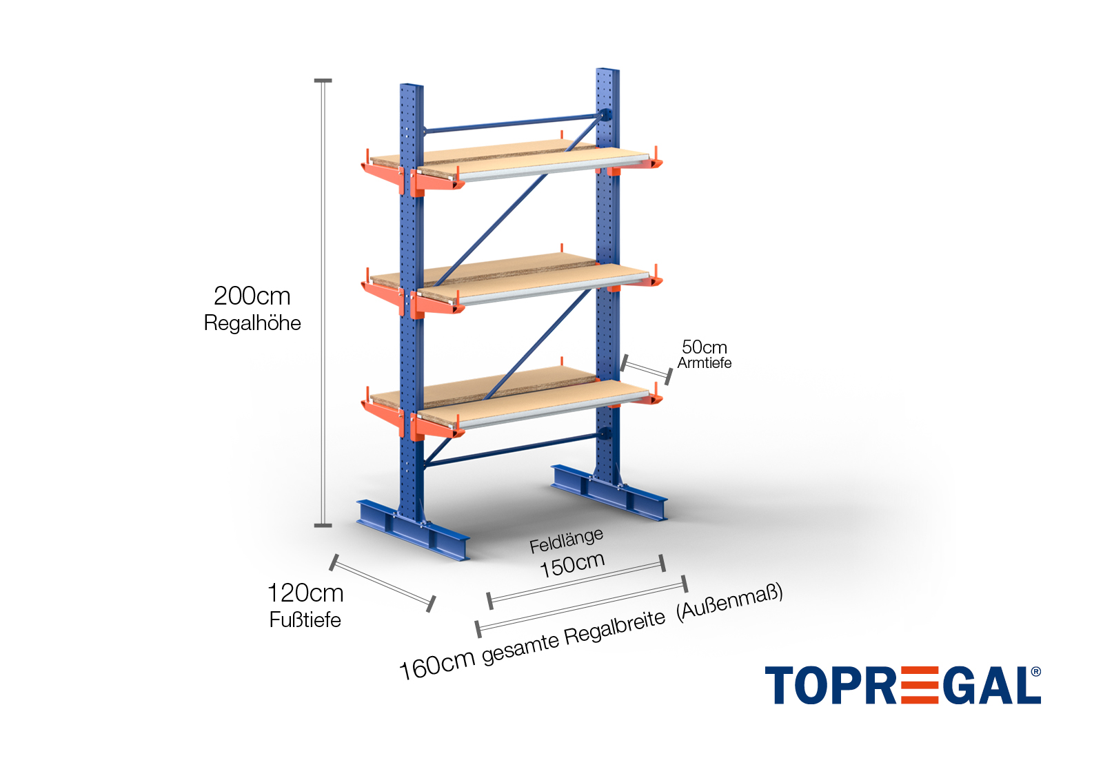 Denne dobbeltsidede grenreol med en bredde på 1,6 m er 2 m høj, har en samlet dybde på 120 cm og er udstyret med 3 grenniveauer med en grendybde på 50 cm. Den maksimale belastning pr. gren udgør således 500 kg. Grenene kan isættes enkeltvis i gittertrin af 50 mm og fastgøres ved hjælp af låsebolte og -stifter. Foddelene kan dermed også (afhængigt af varen) anvendes som opbevaringsplan. For at sikre mod, at lasten utilsigtet falder ud, kan der isættes en afrulningssikring på enden af hver gren. Afrulningssikringen er som standard inkluderet i leveringsomfanget.