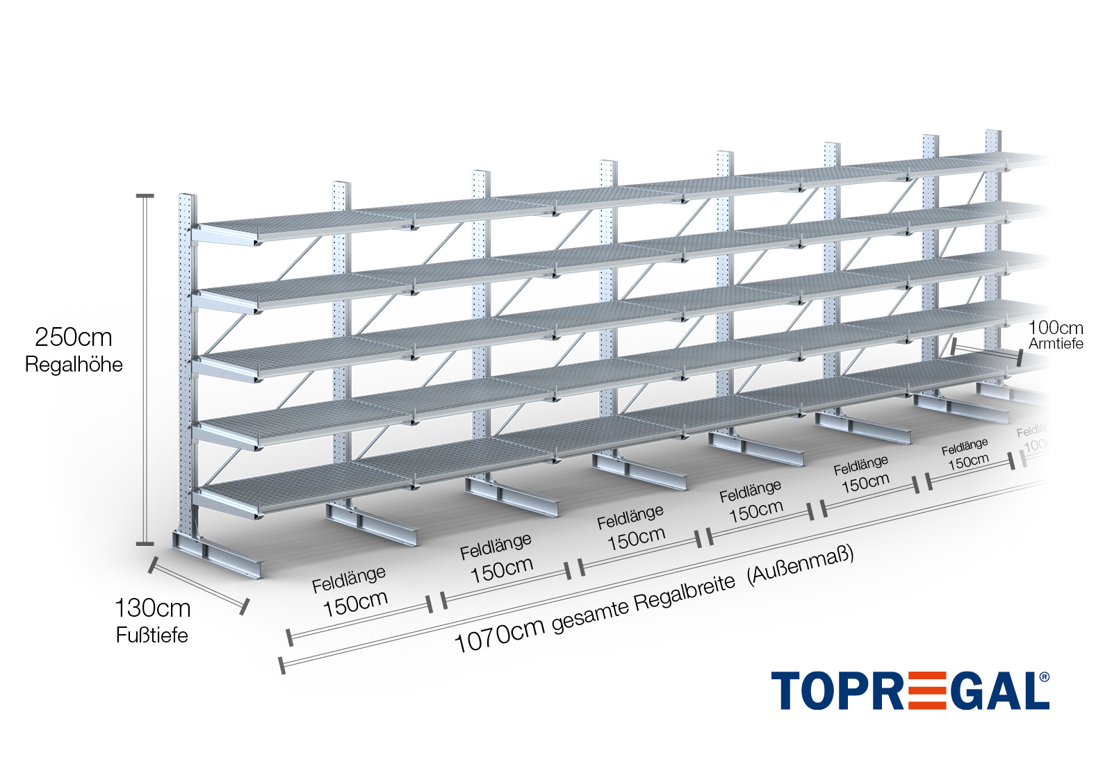 Denne ensidede grenreol med en bredde på 10,7 m er 2,5 m høj, har en samlet dybde på 130 cm og er udstyret med 5 grenniveauer med en grendybde på 100 cm. Den maksimale belastning pr. gren udgør således 500 kg. Grenene kan isættes enkeltvis i gittertrin af 50 mm og fastgøres ved hjælp af låsebolte og -stifter. Foddelene kan dermed også (afhængigt af varen) anvendes som opbevaringsplan. For at sikre mod, at lasten utilsigtet falder ud, kan der isættes en afrulningssikring på enden af hver gren. Afrulningssikringen er som standard inkluderet i leveringsomfanget.
