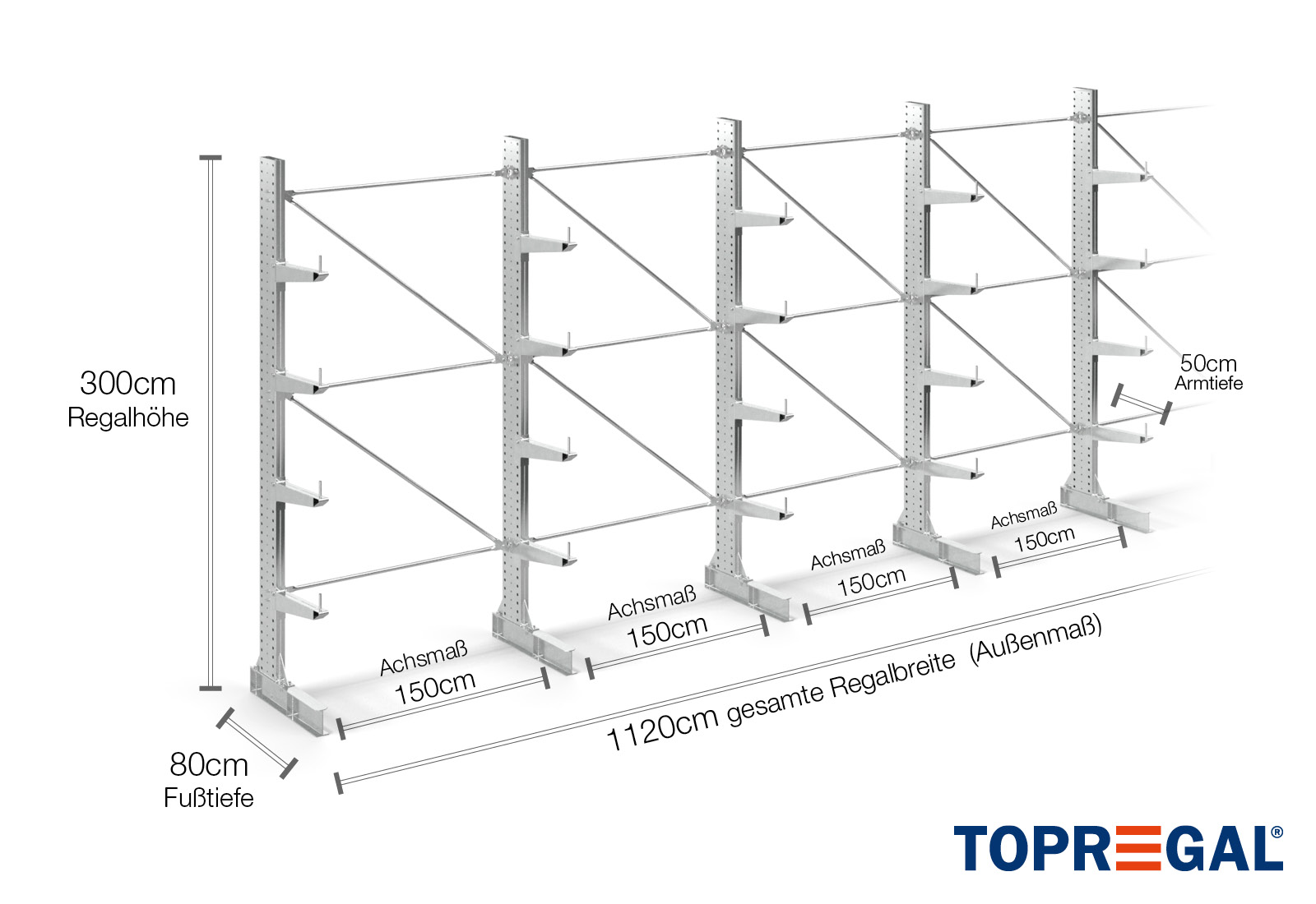 Denne ensidede grenreol med en bredde på 11,2 m er 3 m høj, har en samlet dybde på 80 cm og er udstyret med 4 grenniveauer med en grendybde på 50 cm. Den maksimale belastning pr. gren udgør således 500 kg. Grenene kan isættes enkeltvis i gittertrin af 50 mm og fastgøres ved hjælp af låsebolte og -stifter. Foddelene kan dermed også (afhængigt af varen) anvendes som opbevaringsplan. For at sikre mod, at lasten utilsigtet falder ud, kan der isættes en afrulningssikring på enden af hver gren. Afrulningssikringen er som standard inkluderet i leveringsomfanget.