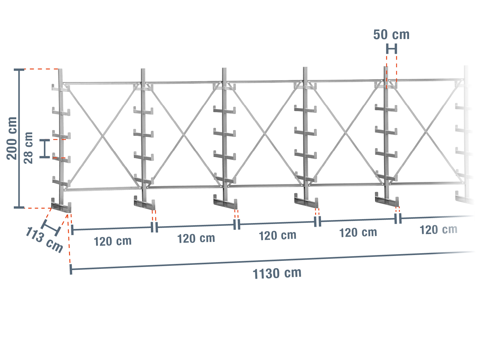Denne særligt robuste grenreol med en bredde på 11,3 m er 2 m høj og har 5 niveauer med en grendybde på 50 cm. Takket være den dobbeltsidede udfærdigelse med allerede påsvejsede grene kan du læsse hver stander med maksimal 2.500 kg, hvorved hver gren har en maksimal belastning på 250 kg.