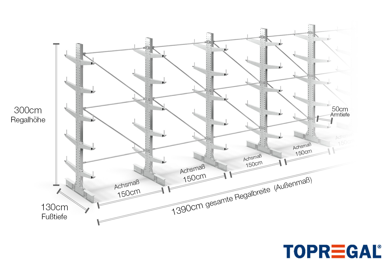 Denne dobbeltsidede grenreol med en bredde på 13,9 m er 3 m høj, har en samlet dybde på 120 cm og er udstyret med 5 grenniveauer med en grendybde på 50 cm. Den maksimale belastning pr. gren udgør således 500 kg. Grenene kan isættes enkeltvis i gittertrin af 50 mm og fastgøres ved hjælp af låsebolte og -stifter. Foddelene kan dermed også (afhængigt af varen) anvendes som opbevaringsplan. For at sikre mod, at lasten utilsigtet falder ud, kan der isættes en afrulningssikring på enden af hver gren. Afrulningssikringen er som standard inkluderet i leveringsomfanget.