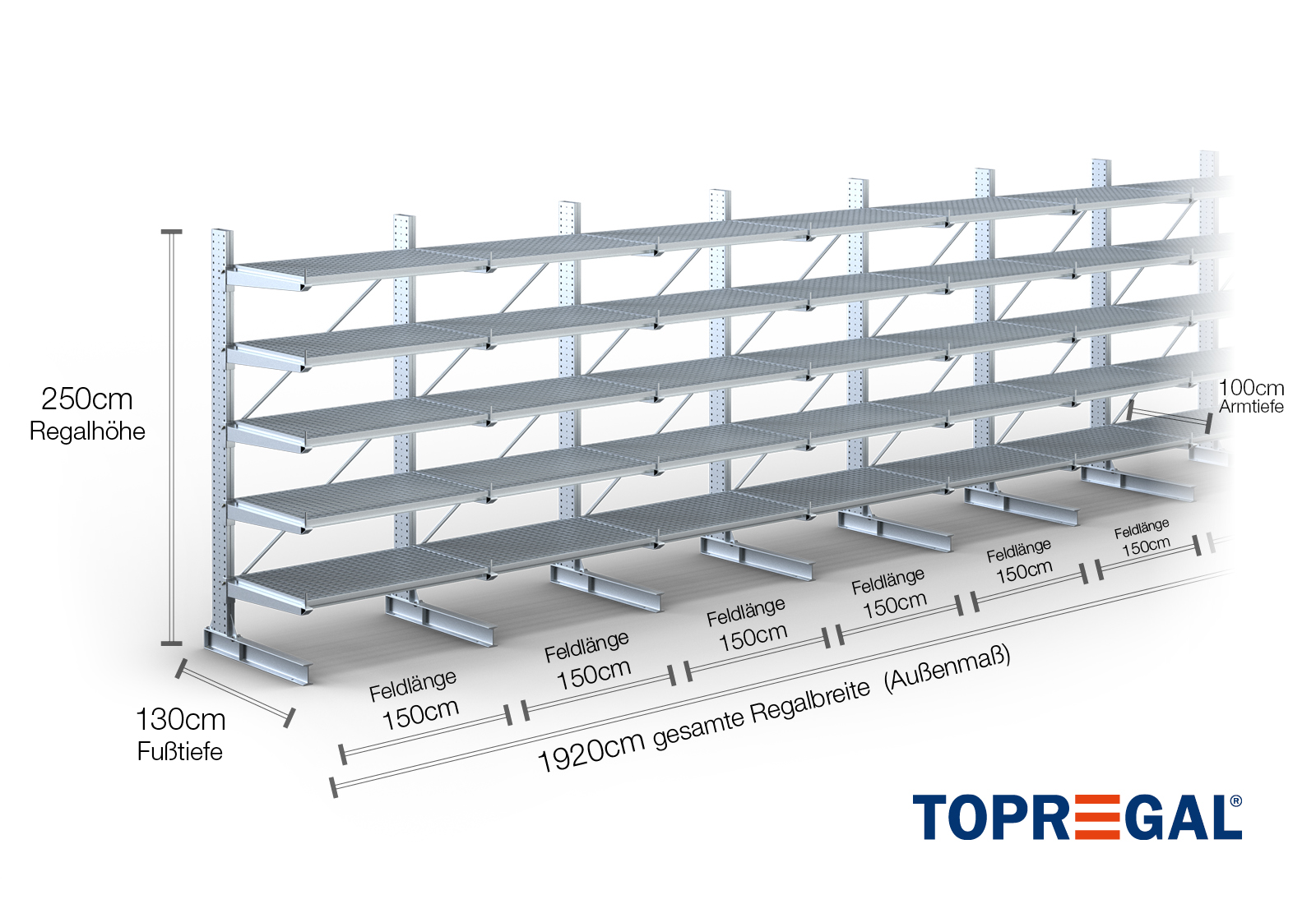 Denne ensidede grenreol med en bredde på 19,2 m er 2,5 m høj, har en samlet dybde på 130 cm og er udstyret med 5 grenniveauer med en grendybde på 100 cm. Den maksimale belastning pr. gren udgør således 500 kg. Grenene kan isættes enkeltvis i gittertrin af 50 mm og fastgøres ved hjælp af låsebolte og -stifter. Foddelene kan dermed også (afhængigt af varen) anvendes som opbevaringsplan. For at sikre mod, at lasten utilsigtet falder ud, kan der isættes en afrulningssikring på enden af hver gren. Afrulningssikringen er som standard inkluderet i leveringsomfanget.