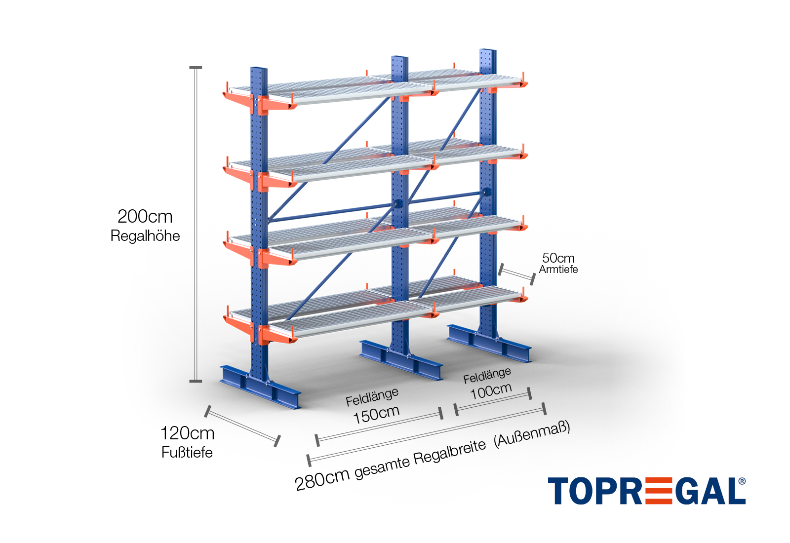 Denne dobbeltsidede grenreol med en bredde på 2,8 m er 2 m høj, har en samlet dybde på 120 cm og er udstyret med 4 grenniveauer med en grendybde på 50 cm. Den maksimale belastning pr. gren udgør således 500 kg. Grenene kan isættes enkeltvis i gittertrin af 50 mm og fastgøres ved hjælp af låsebolte og -stifter. Foddelene kan dermed også (afhængigt af varen) anvendes som opbevaringsplan. For at sikre mod, at lasten utilsigtet falder ud, kan der isættes en afrulningssikring på enden af hver gren. Afrulningssikringen er som standard inkluderet i leveringsomfanget.