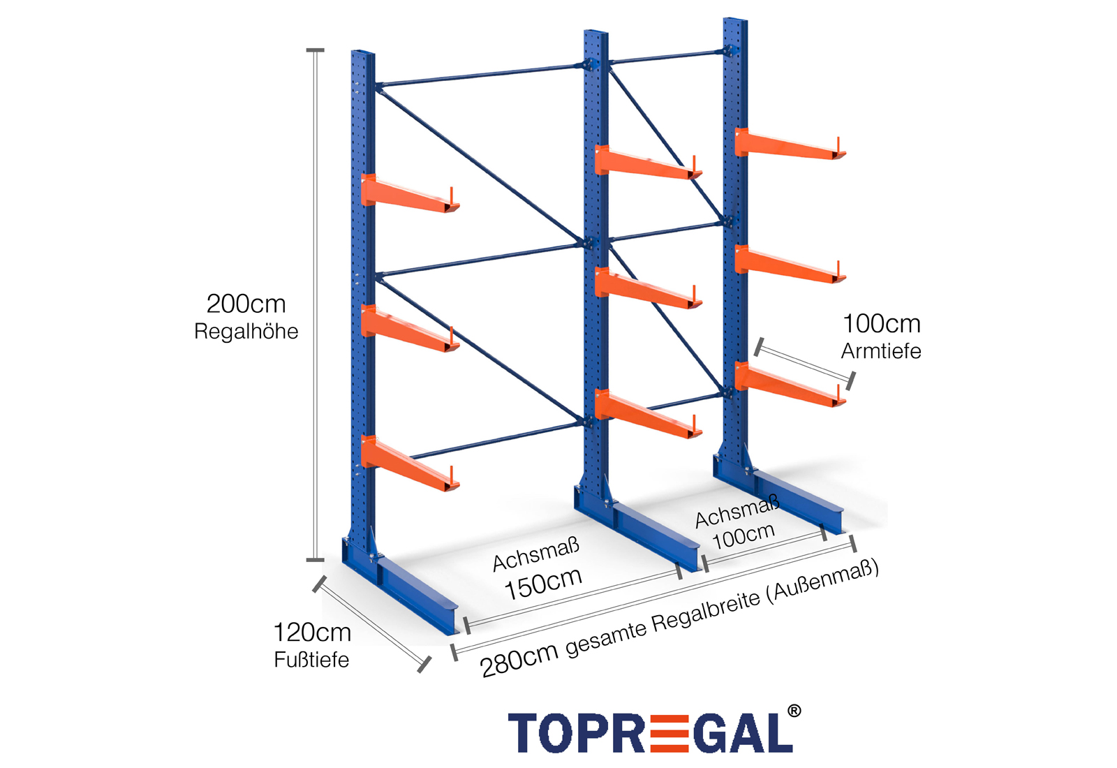 Denne ensidede grenreol med en bredde på 2,8 m er 2 m høj, har en samlet dybde på 120 cm og er udstyret med 3 grenniveauer med en grendybde på 100 cm. Den maksimale belastning pr. gren udgør således 500 kg. Grenene kan isættes enkeltvis i gittertrin af 50 mm og fastgøres ved hjælp af låsebolte og -stifter. Foddelene kan dermed også (afhængigt af varen) anvendes som opbevaringsplan. For at sikre mod, at lasten utilsigtet falder ud, kan der isættes en afrulningssikring på enden af hver gren. Afrulningssikringen er som standard inkluderet i leveringsomfanget.