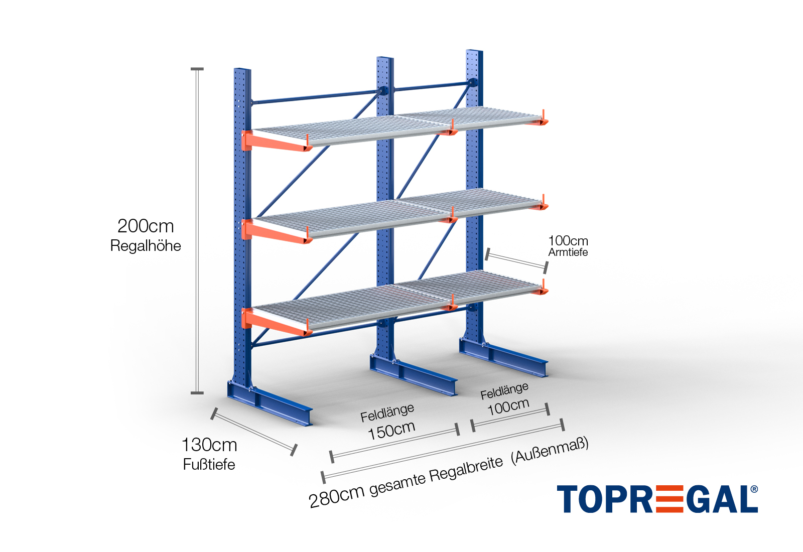 Denne ensidede grenreol med en bredde på 2,8 m er 2 m høj, har en samlet dybde på 120 cm og er udstyret med 3 grenniveauer med en grendybde på 100 cm. Den maksimale belastning pr. gren udgør således 500 kg. Grenene kan isættes enkeltvis i gittertrin af 50 mm og fastgøres ved hjælp af låsebolte og -stifter. Foddelene kan dermed også (afhængigt af varen) anvendes som opbevaringsplan. For at sikre mod, at lasten utilsigtet falder ud, kan der isættes en afrulningssikring på enden af hver gren. Afrulningssikringen er som standard inkluderet i leveringsomfanget.