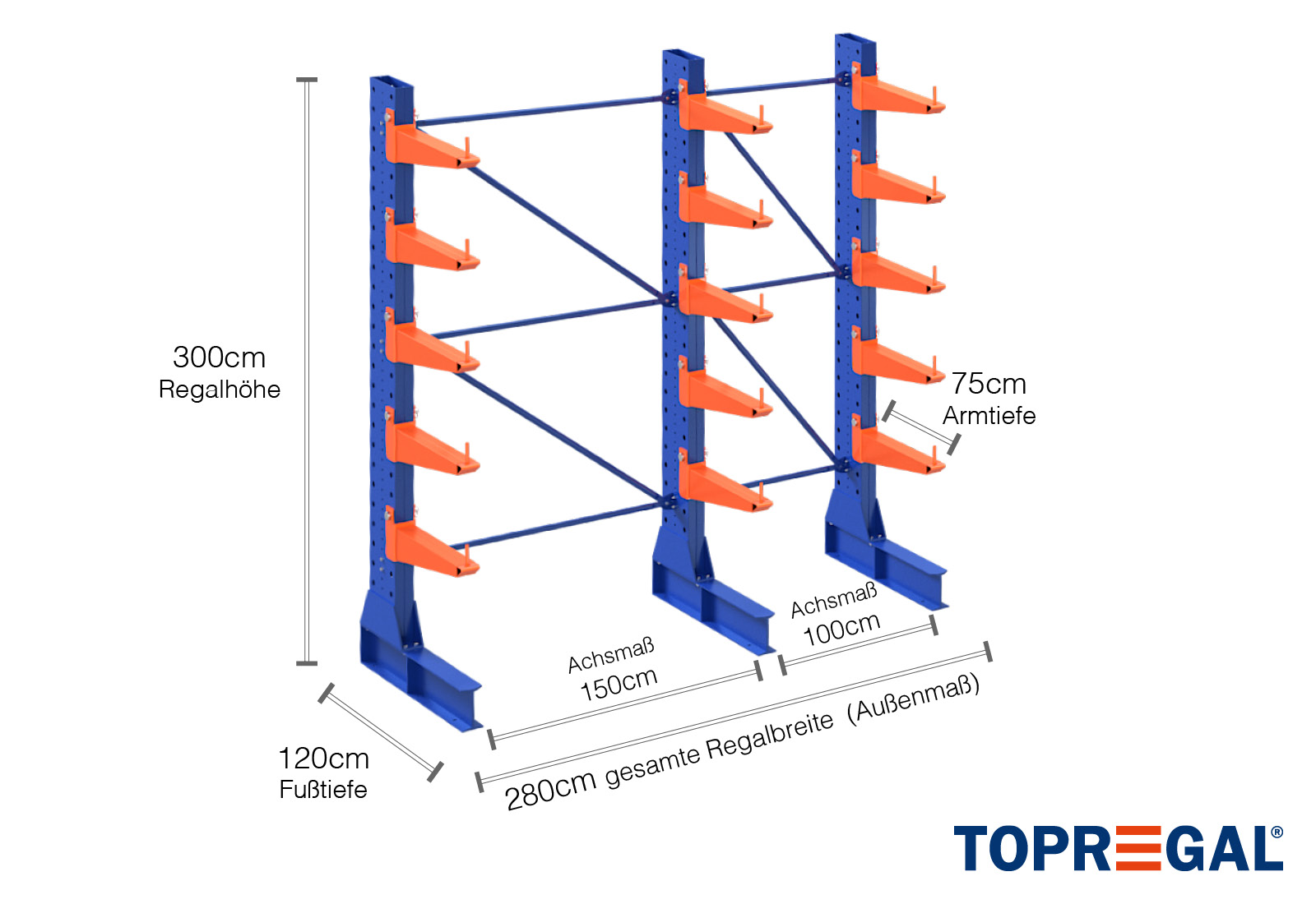 Denne ensidede grenreol med en bredde på 2,8 m er 3 m høj, har en samlet dybde på 120 cm og er udstyret med 5 grenniveauer med en grendybde på 75 cm. Den maksimale belastning pr. gren udgør således 1.000 kg. Grenene kan isættes enkeltvis i gittertrin af 100 mm og fastgøres ved hjælp af låsebolte og -stifter. Foddelene kan dermed også (afhængigt af varen) anvendes som opbevaringsplan. For at sikre mod, at lasten utilsigtet falder ud, kan der isættes en afrulningssikring på enden af hver gren. Afrulningssikringen er som standard inkluderet i leveringsomfanget.