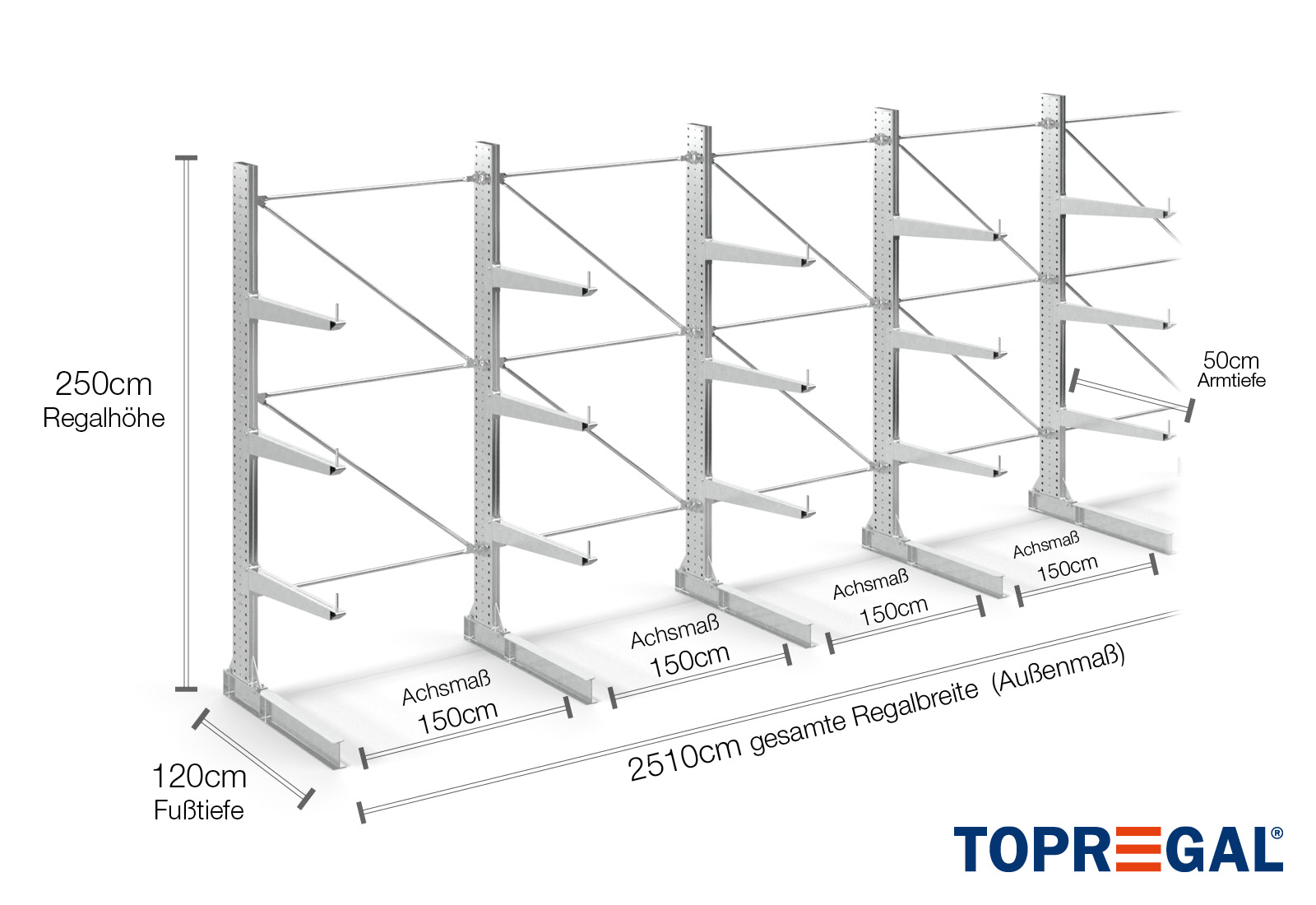 Denne ensidede grenreol med en bredde på 25,1 m er 2,5 m høj, har en samlet dybde på 130 cm og er udstyret med 3 grenniveauer med en grendybde på 100 cm. Den maksimale belastning pr. gren udgør således 500 kg. Grenene kan isættes enkeltvis i gittertrin af 50 mm og fastgøres ved hjælp af låsebolte og -stifter. Foddelene kan dermed også (afhængigt af varen) anvendes som opbevaringsplan. For at sikre mod, at lasten utilsigtet falder ud, kan der isættes en afrulningssikring på enden af hver gren. Afrulningssikringen er som standard inkluderet i leveringsomfanget.