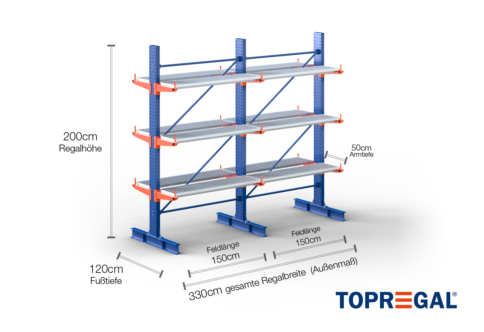 Denne dobbeltsidede grenreol med en bredde på 3,3 m er 2 m høj, har en samlet dybde på 120 cm og er udstyret med 3 grenniveauer med en grendybde på 50 cm. Den maksimale belastning pr. gren udgør således 500 kg. Grenene kan isættes enkeltvis i gittertrin af 50 mm og fastgøres ved hjælp af låsebolte og -stifter. Foddelene kan dermed også (afhængigt af varen) anvendes som opbevaringsplan. For at sikre mod, at lasten utilsigtet falder ud, kan der isættes en afrulningssikring på enden af hver gren. Afrulningssikringen er som standard inkluderet i leveringsomfanget.