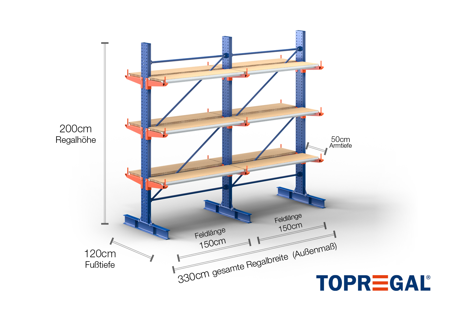Denne dobbeltsidede grenreol med en bredde på 3,3 m er 2 m høj, har en samlet dybde på 120 cm og er udstyret med 3 grenniveauer med en grendybde på 50 cm. Den maksimale belastning pr. gren udgør således 500 kg. Grenene kan isættes enkeltvis i gittertrin af 50 mm og fastgøres ved hjælp af låsebolte og -stifter. Foddelene kan dermed også (afhængigt af varen) anvendes som opbevaringsplan. For at sikre mod, at lasten utilsigtet falder ud, kan der isættes en afrulningssikring på enden af hver gren. Afrulningssikringen er som standard inkluderet i leveringsomfanget.