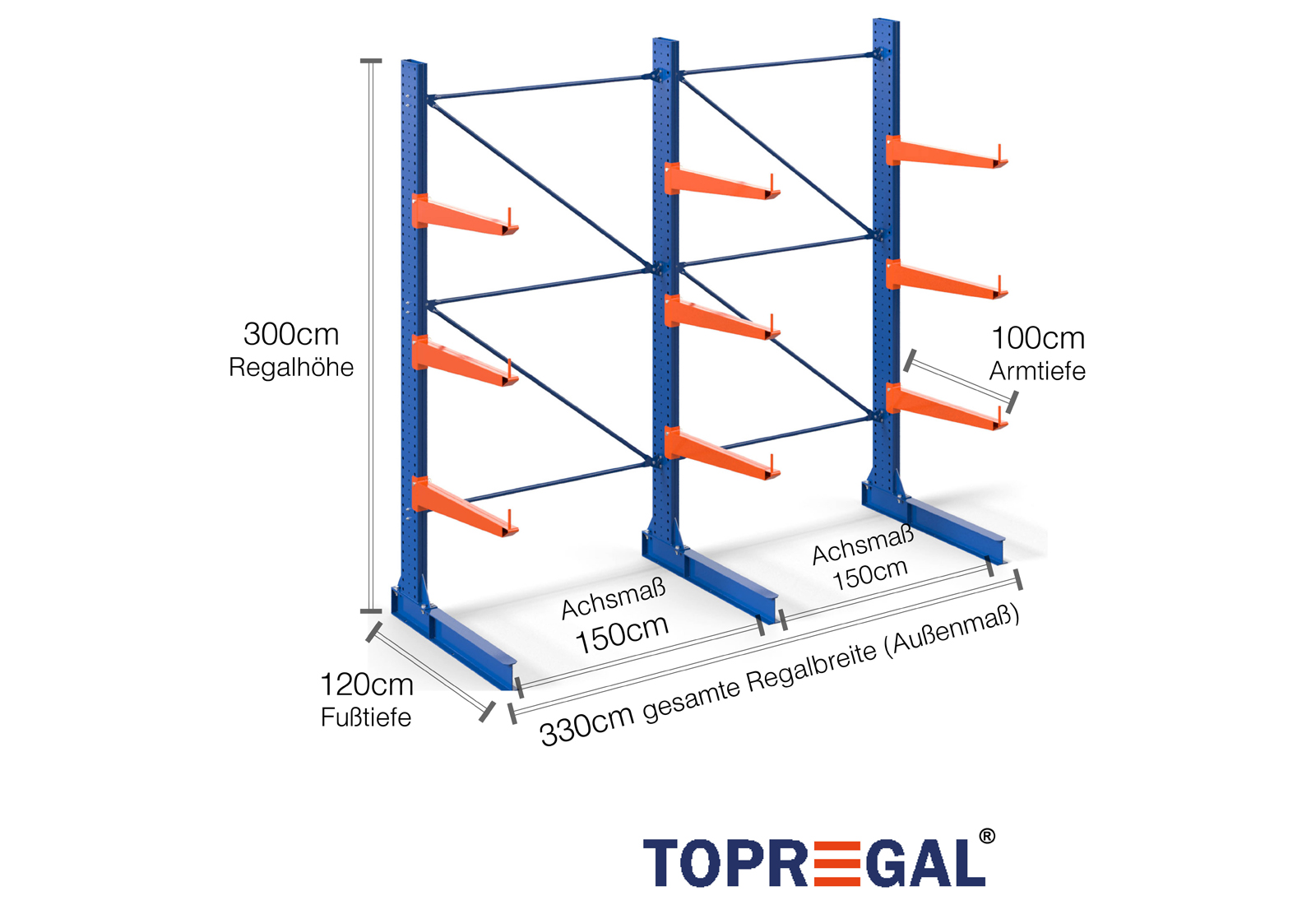 Denne ensidede grenreol med en bredde på 3,3 m er 3 m høj, har en samlet dybde på 120 cm og er udstyret med 3 grenniveauer med en grendybde på 100 cm. Den maksimale belastning pr. gren udgør således 500 kg. Grenene kan isættes enkeltvis i gittertrin af 50 mm og fastgøres ved hjælp af låsebolte og -stifter. Foddelene kan dermed også (afhængigt af varen) anvendes som opbevaringsplan. For at sikre mod, at lasten utilsigtet falder ud, kan der isættes en afrulningssikring på enden af hver gren. Afrulningssikringen er som standard inkluderet i leveringsomfanget.