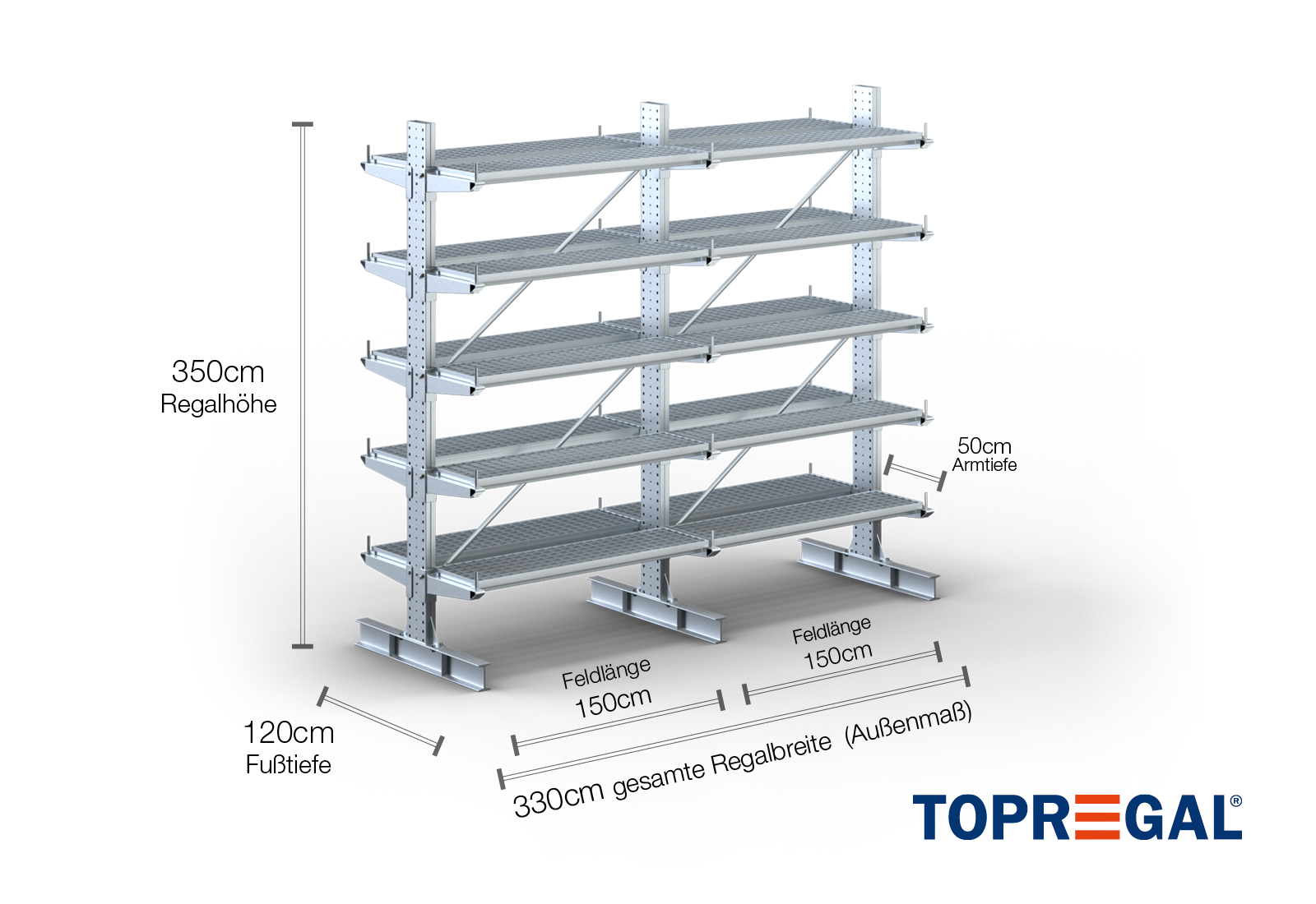 Denne dobbeltsidede grenreol med en bredde på 3,3 m er 3,5 m høj, har en samlet dybde på 120 cm og er udstyret med 5 grenniveauer med en grendybde på 50 cm. Den maksimale belastning pr. gren udgør således 500 kg. Grenene kan isættes enkeltvis i gittertrin af 50 mm og fastgøres ved hjælp af låsebolte og -stifter. Foddelene kan dermed også (afhængigt af varen) anvendes som opbevaringsplan. For at sikre mod, at lasten utilsigtet falder ud, kan der isættes en afrulningssikring på enden af hver gren. Afrulningssikringen er som standard inkluderet i leveringsomfanget.