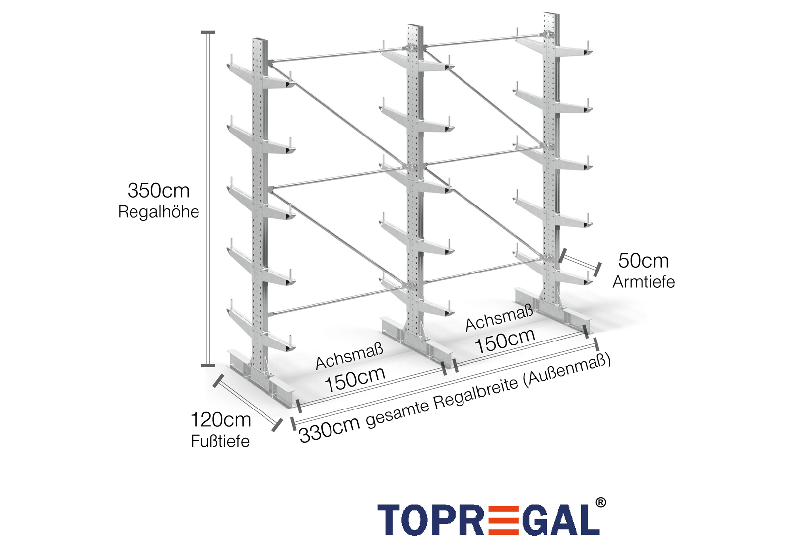 Denne dobbeltsidede grenreol med en bredde på 3,3 m er 3,5 m høj, har en samlet dybde på 120 cm og er udstyret med 5 grenniveauer med en grendybde på 50 cm. Den maksimale belastning pr. gren udgør således 500 kg. Grenene kan isættes enkeltvis i gittertrin af 50 mm og fastgøres ved hjælp af låsebolte og -stifter. Foddelene kan dermed også (afhængigt af varen) anvendes som opbevaringsplan. For at sikre mod, at lasten utilsigtet falder ud, kan der isættes en afrulningssikring på enden af hver gren. Afrulningssikringen er som standard inkluderet i leveringsomfanget.