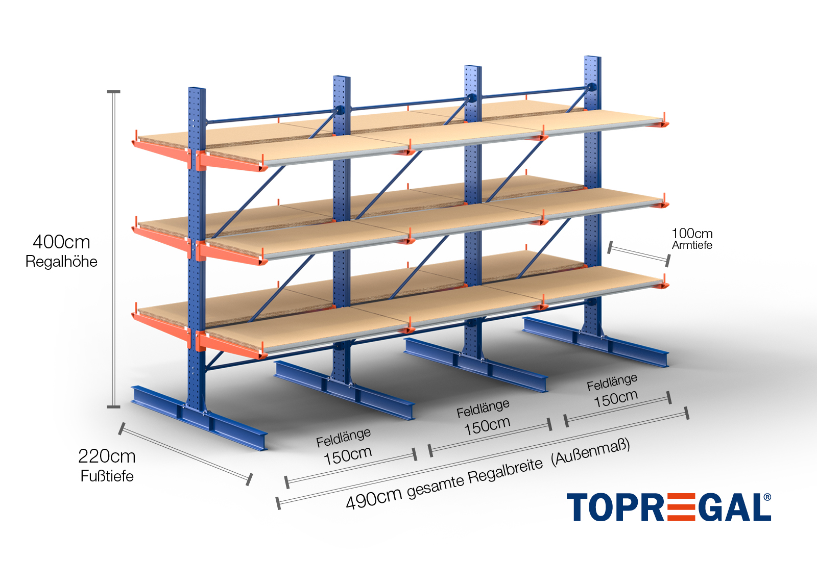 Denne dobbeltsidede grenreol med en bredde på 4,9 m er 4 m høj, har en samlet dybde på 220 cm og er udstyret med 3 grenniveauer med en grendybde på 100 cm. Den maksimale belastning pr. gren udgør således 500 kg. Grenene kan isættes enkeltvis i gittertrin af 50 mm og fastgøres ved hjælp af låsebolte og -stifter. Foddelene kan dermed også (afhængigt af varen) anvendes som opbevaringsplan. For at sikre mod, at lasten utilsigtet falder ud, kan der isættes en afrulningssikring på enden af hver gren. Afrulningssikringen er som standard inkluderet i leveringsomfanget.