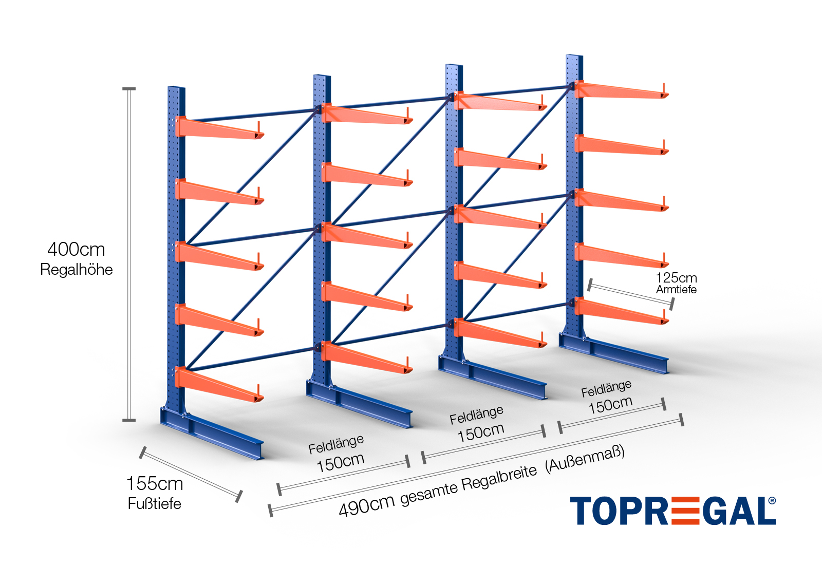 Denne ensidede grenreol med en bredde på 4,9 m er 4 m høj, har en samlet dybde på 155 cm og er udstyret med 5 grenniveauer med en grendybde på 125 cm. Den maksimale belastning pr. gren udgør således 500 kg. Grenene kan isættes enkeltvis i gittertrin af 50 mm og fastgøres ved hjælp af låsebolte og -stifter. Foddelene kan dermed også (afhængigt af varen) anvendes som opbevaringsplan. For at sikre mod, at lasten utilsigtet falder ud, kan der isættes en afrulningssikring på enden af hver gren. Afrulningssikringen er som standard inkluderet i leveringsomfanget.