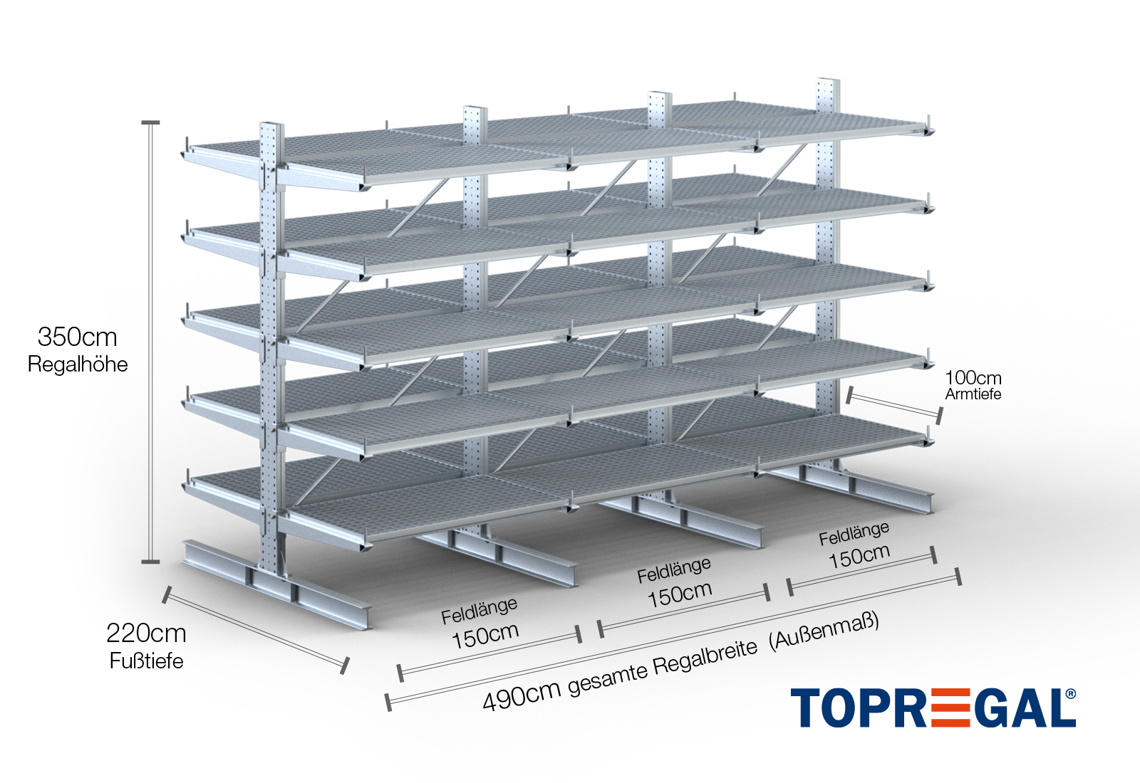 Denne dobbeltsidede grenreol med en bredde på 4,9 m er 3,5 m høj, har en samlet dybde på 220 cm og er udstyret med 5 grenniveauer med en grendybde på 100 cm. Den maksimale belastning pr. gren udgør således 500 kg. Grenene kan isættes enkeltvis i gittertrin af 50 mm og fastgøres ved hjælp af låsebolte og -stifter. Foddelene kan dermed også (afhængigt af varen) anvendes som opbevaringsplan. For at sikre mod, at lasten utilsigtet falder ud, kan der isættes en afrulningssikring på enden af hver gren. Afrulningssikringen er som standard inkluderet i leveringsomfanget.