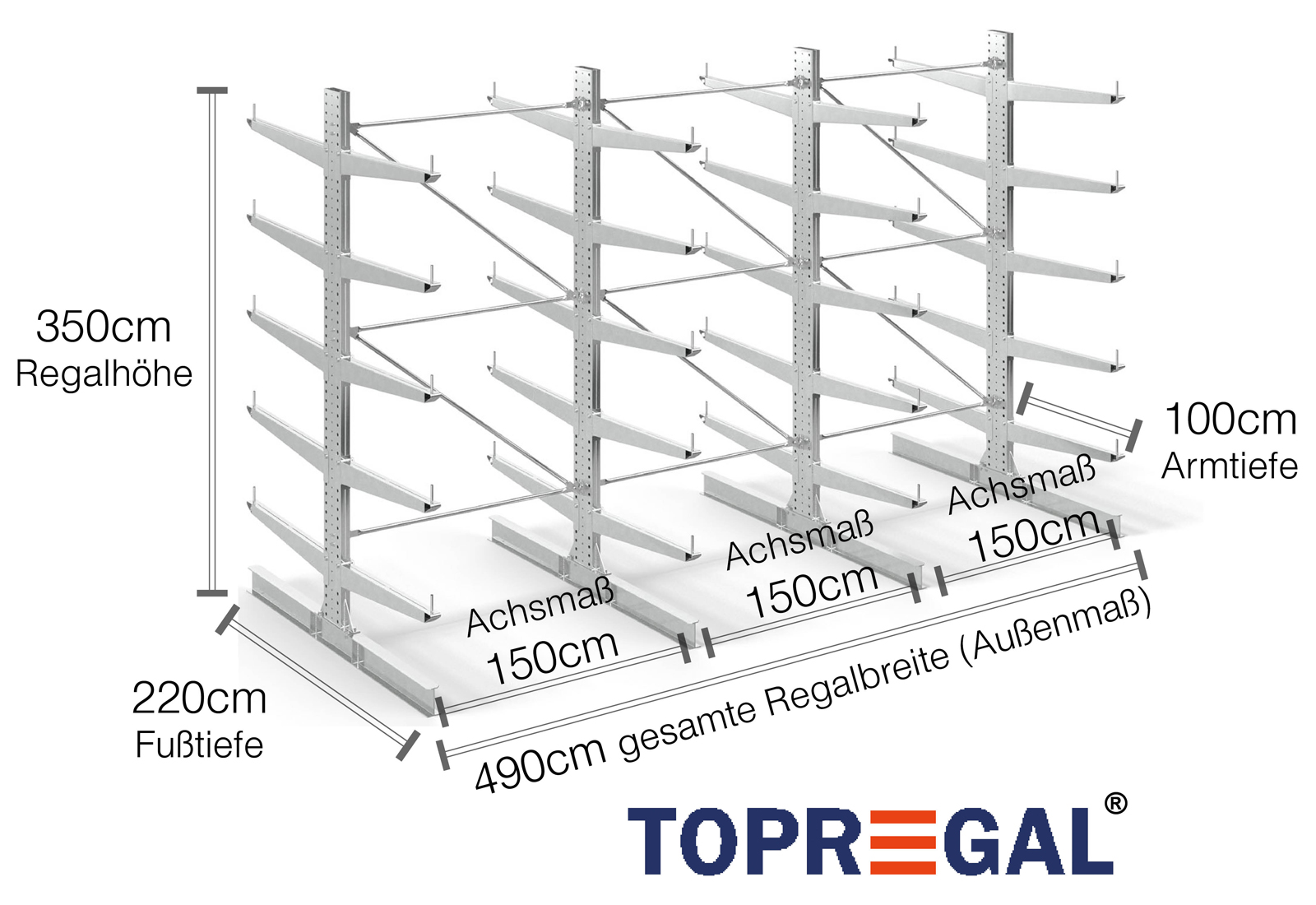 Denne dobbeltsidede grenreol med en bredde på 4,9 m er 3,5 m høj, har en samlet dybde på 220 cm og er udstyret med 5 grenniveauer med en grendybde på 100 cm. Den maksimale belastning pr. gren udgør således 500 kg. Grenene kan isættes enkeltvis i gittertrin af 50 mm og fastgøres ved hjælp af låsebolte og -stifter. Foddelene kan dermed også (afhængigt af varen) anvendes som opbevaringsplan. For at sikre mod, at lasten utilsigtet falder ud, kan der isættes en afrulningssikring på enden af hver gren. Afrulningssikringen er som standard inkluderet i leveringsomfanget.