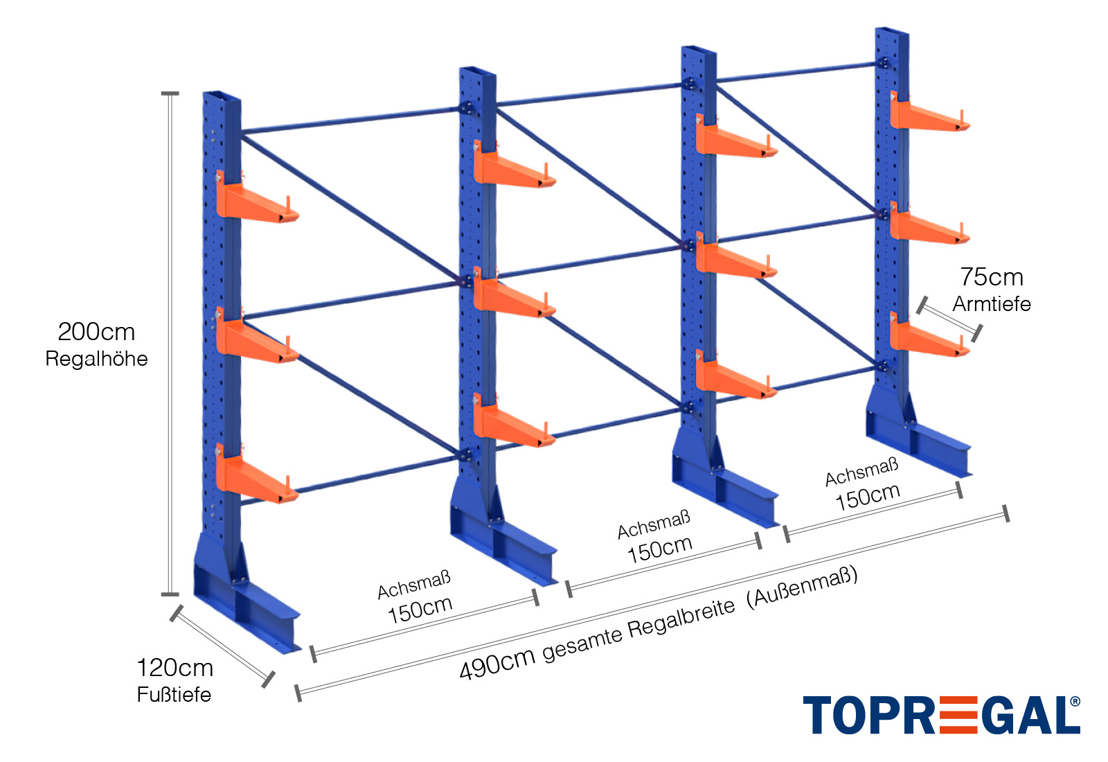 Denne ensidede grenreol med en bredde på 4,9 m er 2 m høj, har en samlet dybde på 120 cm og er udstyret med 3 grenniveauer med en grendybde på 75 cm. Den maksimale belastning pr. gren udgør således 1.000 kg. Grenene kan isættes enkeltvis i gittertrin af 100 mm og fastgøres ved hjælp af låsebolte og -stifter. Foddelene kan dermed også (afhængigt af varen) anvendes som opbevaringsplan. For at sikre mod, at lasten utilsigtet falder ud, kan der isættes en afrulningssikring på enden af hver gren. Afrulningssikringen er som standard inkluderet i leveringsomfanget.