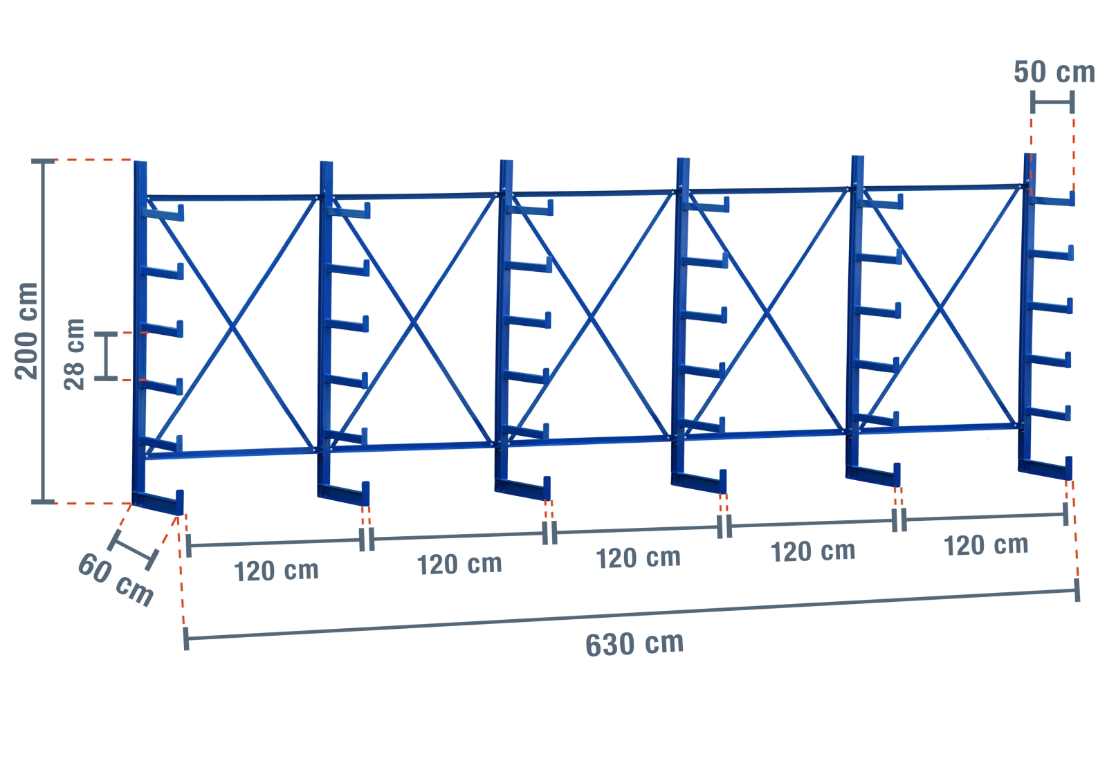 Denne særligt robuste grenreol med en bredde på 6,3 m er 2 m høj og har 5 niveauer med en grendybde på 50 cm. Takket være den ensidede udfærdigelse med allerede påsvejsede grene kan du læsse hver stander med maksimal 1.250 kg, hvorved hver gren har en maksimal belastning på 250 kg.