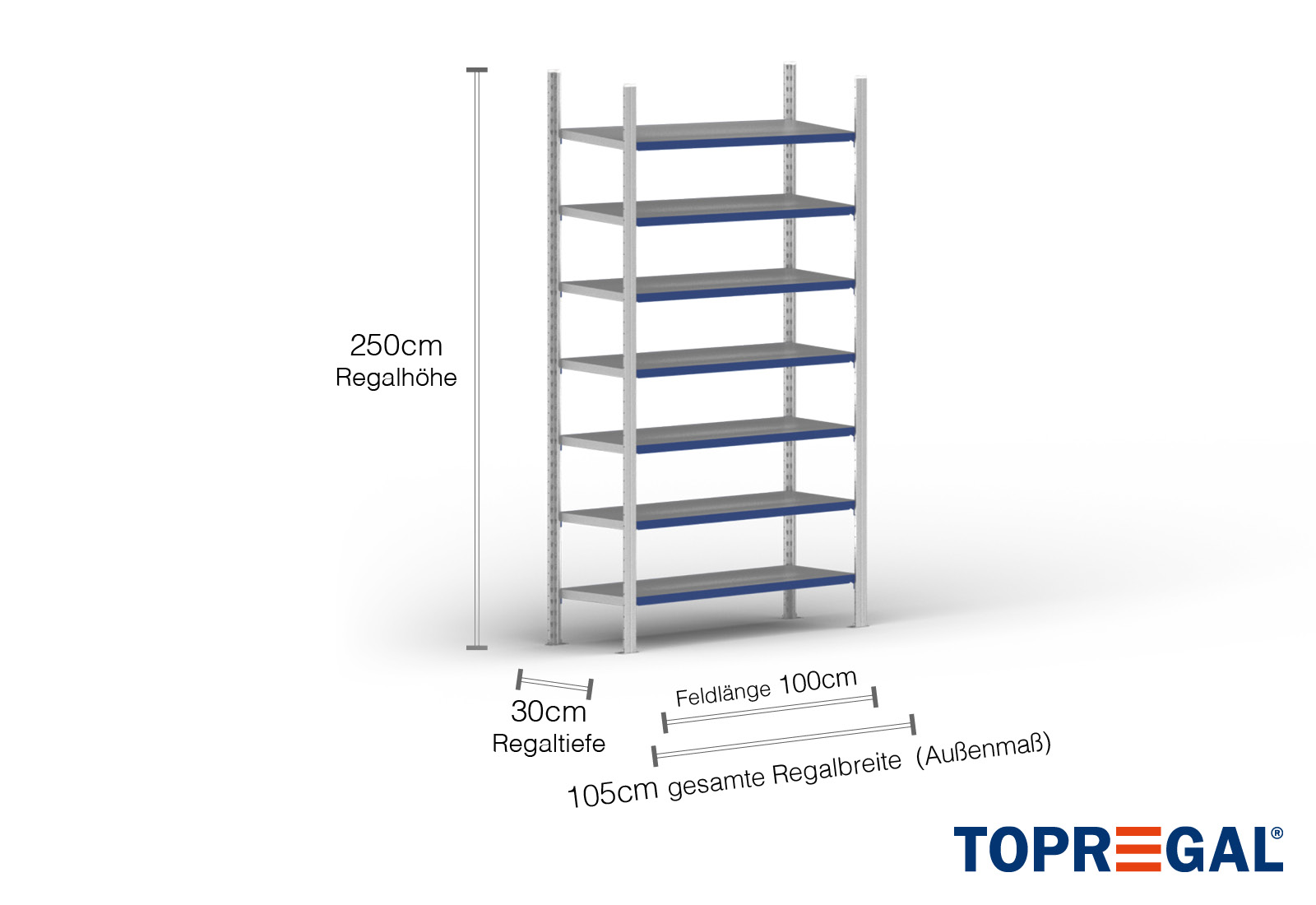 Alle data refererer til jævnt fordelte belastninger. Ved belastning må hylde- og feltbelastningen ikke overskrides. I princippet gælder de aktuelle retningslinjer for sikkerhed og sundhed på arbejdspladsen (Tysk DGUV-regel 208-061) under brug. TOPREGAL påtager sig intet ansvar for ulykker/skader forårsaget af ukorrekt brug. Vores ekspertrådgivningsteam vil med glæde besvare eventuelle spørgsmål, du måtte have. De angivne mål er omtrentlige og kan afvige med nogle få centimeter. Kontakt os, hvis du har brug for de nøjagtige mål til dit ønskede produkt.
