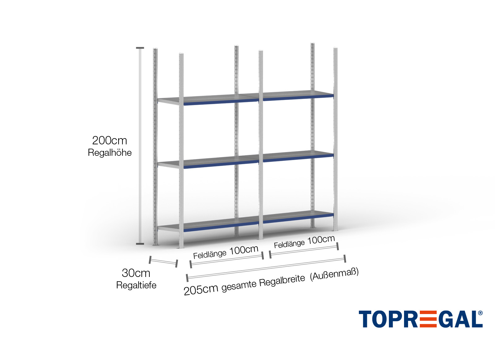 2 m stålreol FB200 / 30 cm dyb / 2 m høj / 3 niveauer / hylde stål / hyldebelastning 200 kg