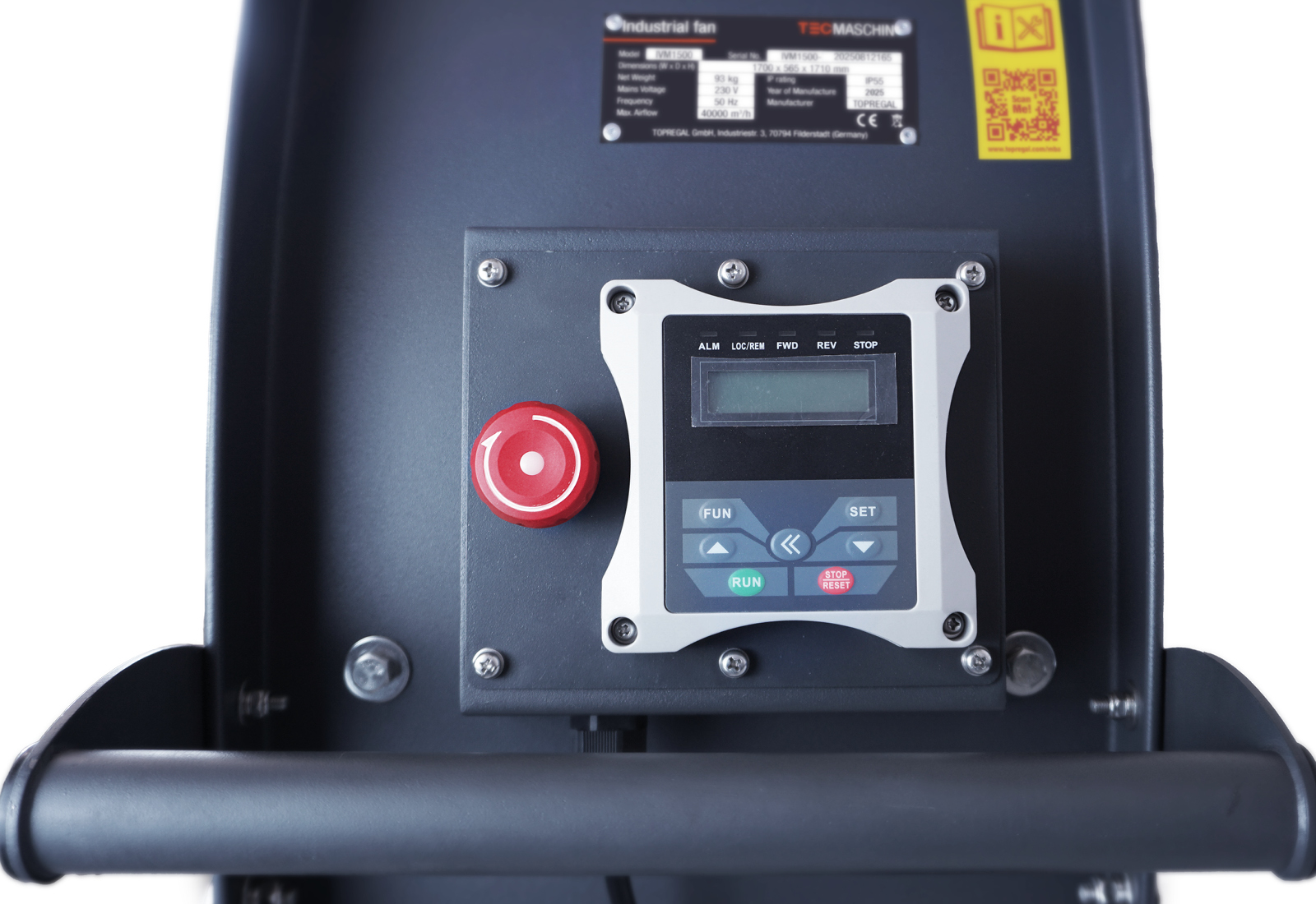 Med sin store diameter på 1.500 mm flytter den op til 40.000 m³/h luft i timen – nok til at ventilere selv større haller ordentligt. Målene er ca. 1.700 mm x 565 mm x 1.710 mm, og vægten er 93 kg. To løberuller og to drejeruller (Ø 140 mm) af gummi gør det nemmere at placere ventilatoren på stedet. Det 8 m lange tilslutningskabel giver yderligere fleksibilitet ved opsætning. Ventilatoren styres via et betjeningspanel med knapper på siden. Hastigheden kan justeres i trin på 30, hvilket muliggør en målrettet indstilling til forskellige anvendelsesformål.