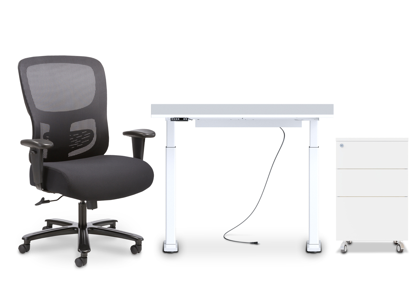 Kontormøbelsæt: XXL-kontorstol TINA, højdejusterbart skrivebord MILLA120 og mobil piedestal FRIDA fra TOPREGAL