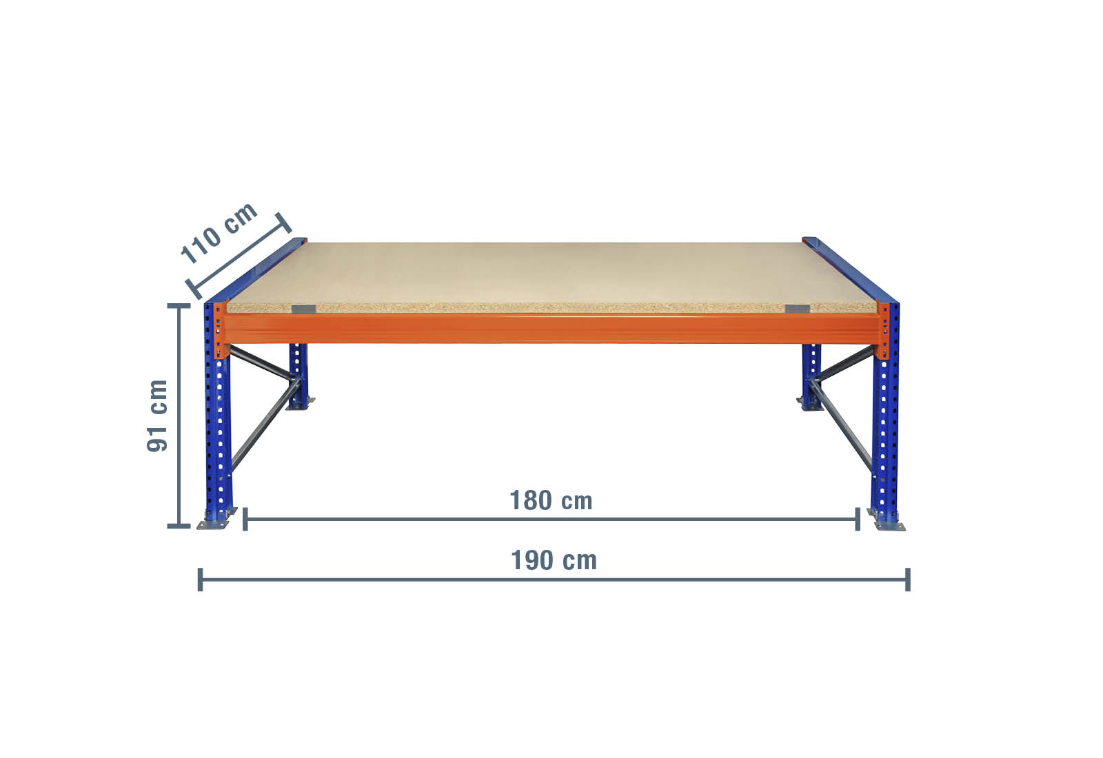 Dette pakkebord med målene 1,9 m x 110 cm x 0,91 m er udstyret med 1træhyldeplader til pallereoler, som består af en ubehandlet spånplade. Dette gør det muligt at opbevare og behandle tørt gods. Træhyldepladen kan sikkert placeres på de orangelakerede traverser med medfølgende Z-plader. Denne konstruktion forhindrer reolhylden i at rykke sig og falde ud og fremmer således arbejdssikkerheden. De enkelte niveauer kan isættes enkeltvis i trin af 50 mm. Den anvendelige hyldeoverflade på dette pakkebord beløber sig på 180 cm.