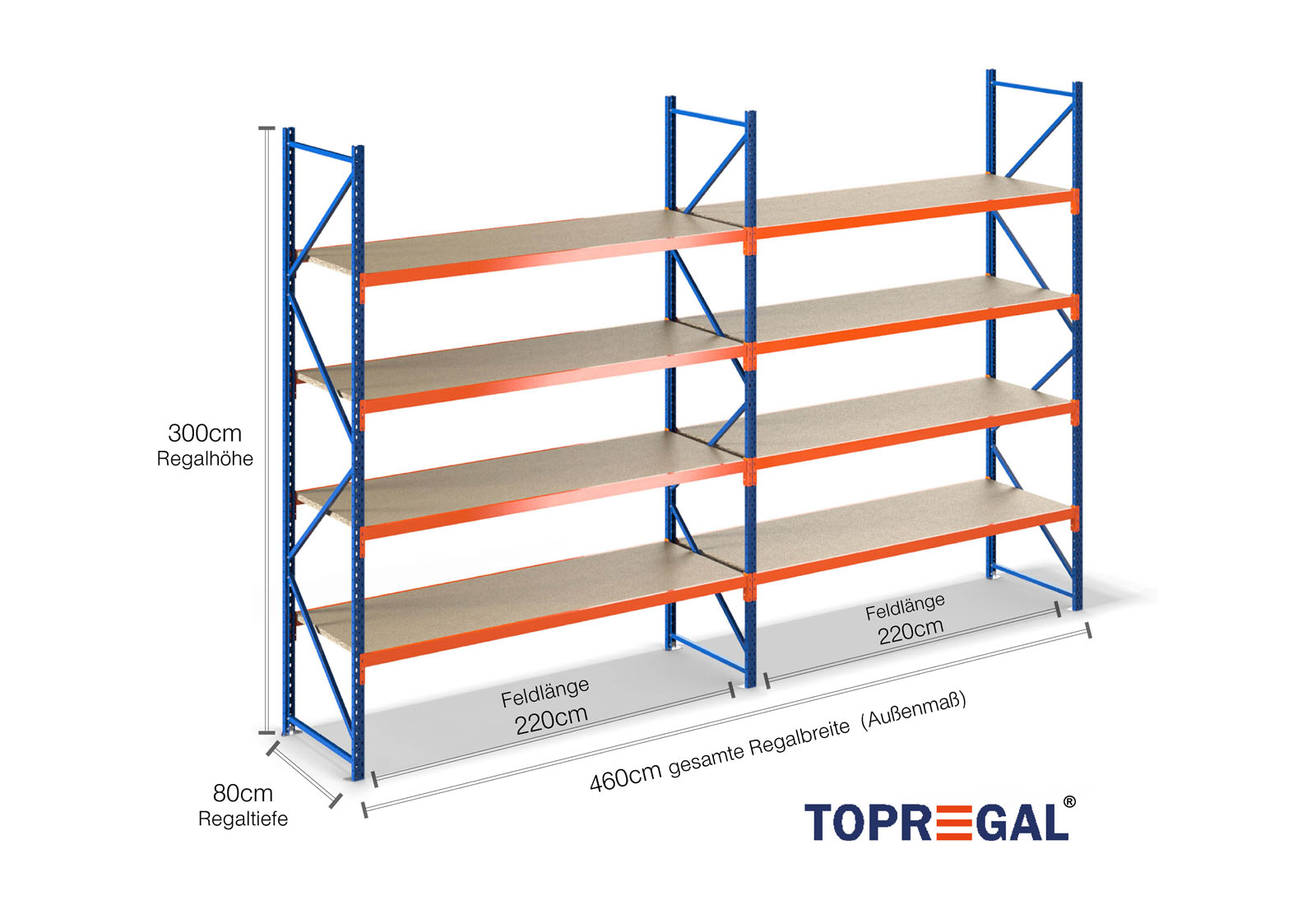 Denne opbevaringsreol imponerer med sin højde på 3 m, er 80 cm dyb og har en bredde på 4,6 m. 4 Niveauerne giver hver især en maksimal belastning på 500 kg, hvorved den maksimale belastning mellem to standere (feltbelastningen) på 2.000 kg ikke må overskrides. Disse oplysninger henviser altid til en ensartet belastning af reolerne. Indstikssystemet gør konstruktionen hurtig og nem. Til de brede reoler fra TOPREGAL findes også et omfattende udvalg af individuelle dele og tilbehør såsom reolstandere, traverser, magnetbånd og gennemsigtige lagerkasser.