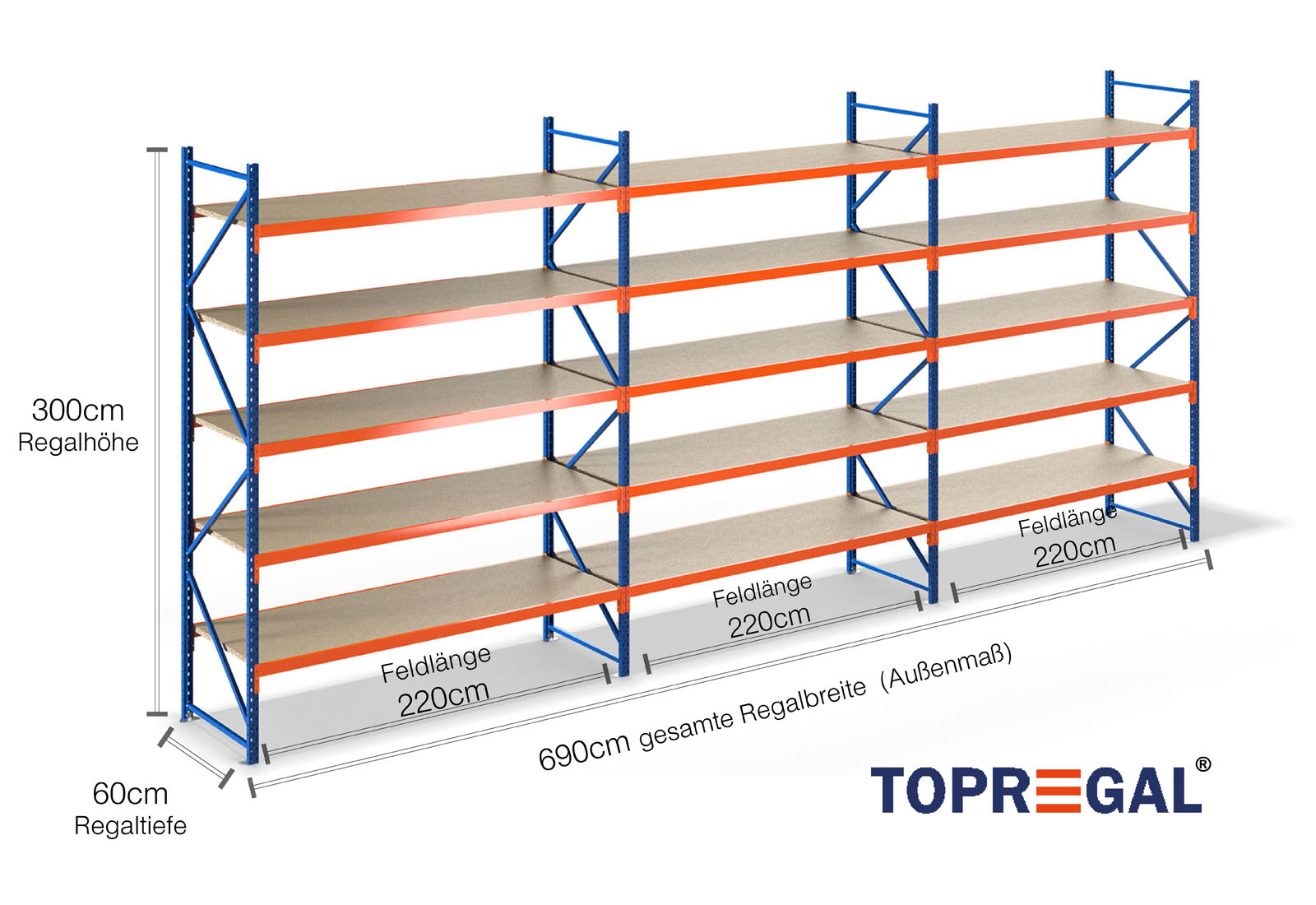 6,9 m opbevaringsreol LR2000 / 60 cm dyb / 3 m høj / 5 niveauer / hylde træ
