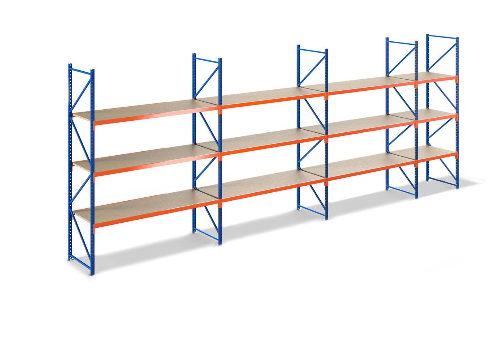 8,0 m opbevaringsreol LR2000 / 60 cm dyb / 3,5 m høj / 3 niveauer / hylde træ
