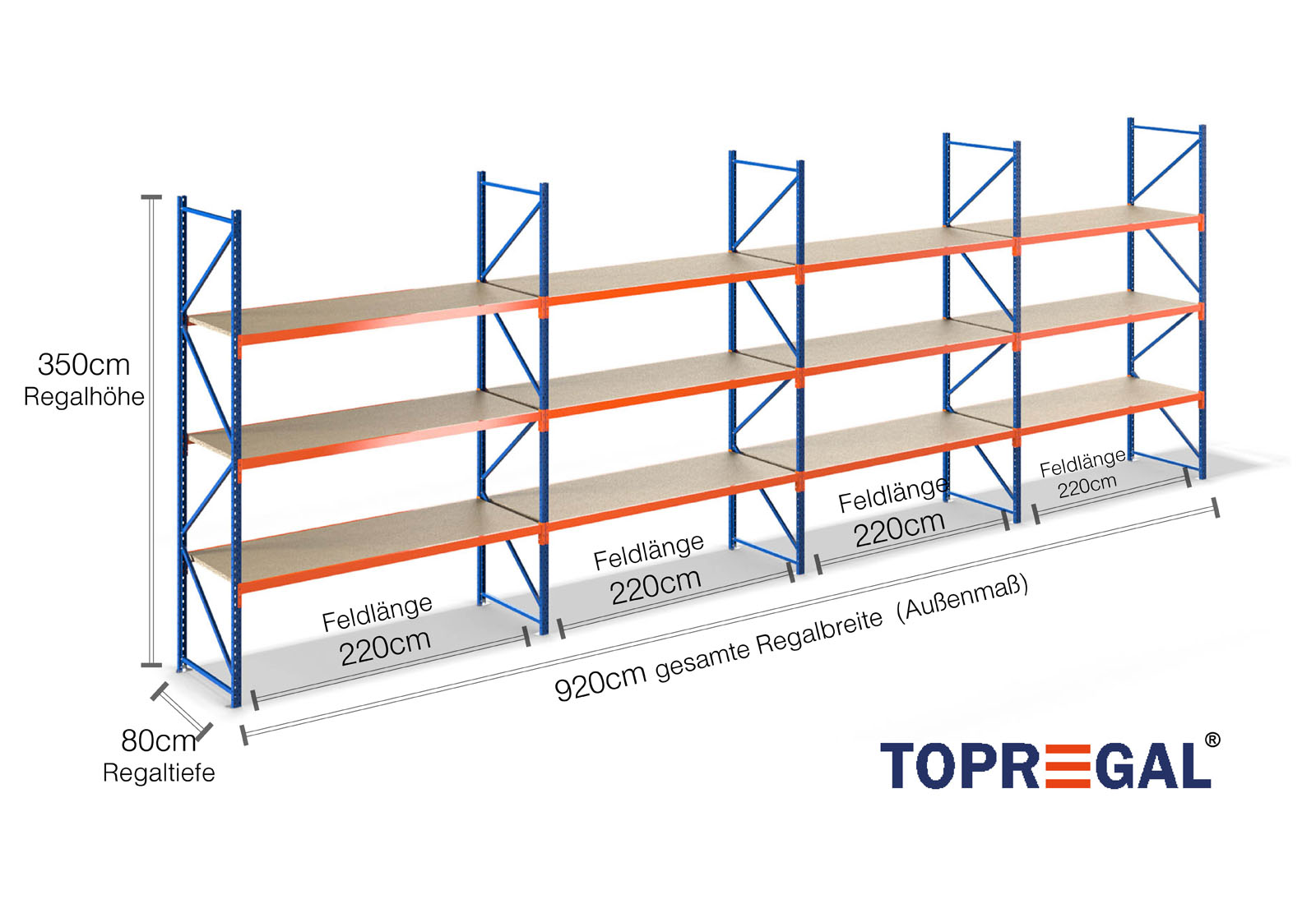 9,2 m opbevaringsreol LR2000 / 80 cm dyb / 3,5 m høj / 3 niveauer / hylde træ