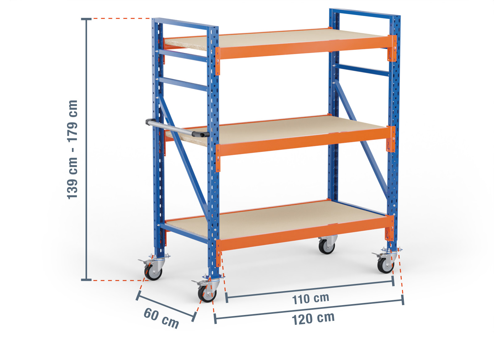 1,2 m opbevaringsreol mobil LR2000 / 60 cm dyb / 1.390 - 1.790 mm høj / 3 niveauer / hylde træ