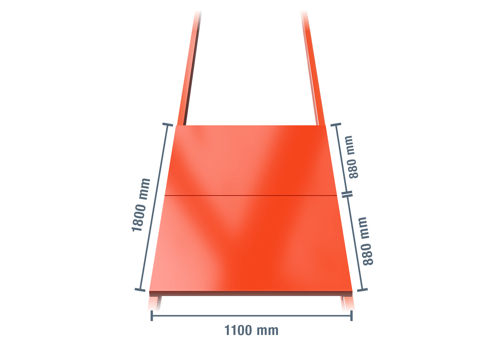 Stålhylden til pallereolen består af 2 moduler med en dybde på 1.100 mm og en bredde på 885 mm. På denne måde når den en samlet bredde på 1.800 mm. Hvert modul kan modstå en maksimal belastning på 1.000 kg.