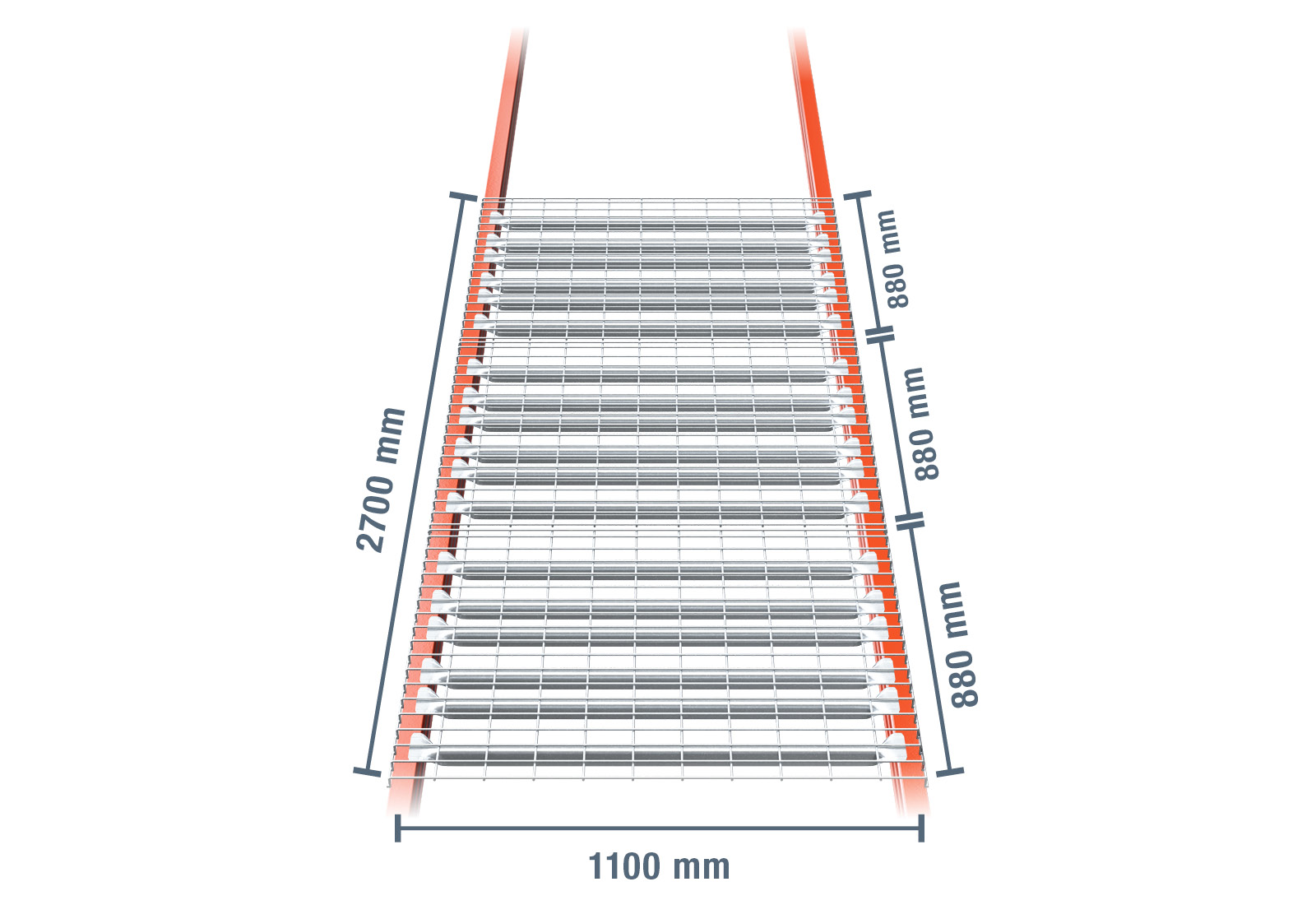 Denne trådgitterhylde er sammensat af 3trådgittermoduler med en dybde på 1.100 mm og en bredde på 880 mm. Dette bringer det til en samlet bredde på 270 cm. Trådgitteret har en maksimal belastningskapacitet ved ensartet belastningsfordeling på 4.500 kg. Ved fyldning af din pallereol skal du være opmærksom på de angivne maksimale hylde- og feltbelastninger for PR15000. Til udendørs brug anbefaler vi reolen med gitterristhylder af galvaniseret stål.