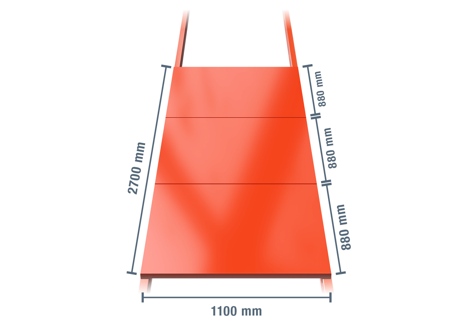 Stålhylden til pallereolen består af 3 moduler med en dybde på 1.100 mm og en bredde på 885 mm. På denne måde når den en samlet bredde på 2.700 mm. Hvert modul kan modstå en maksimal belastning på 1.000 kg.