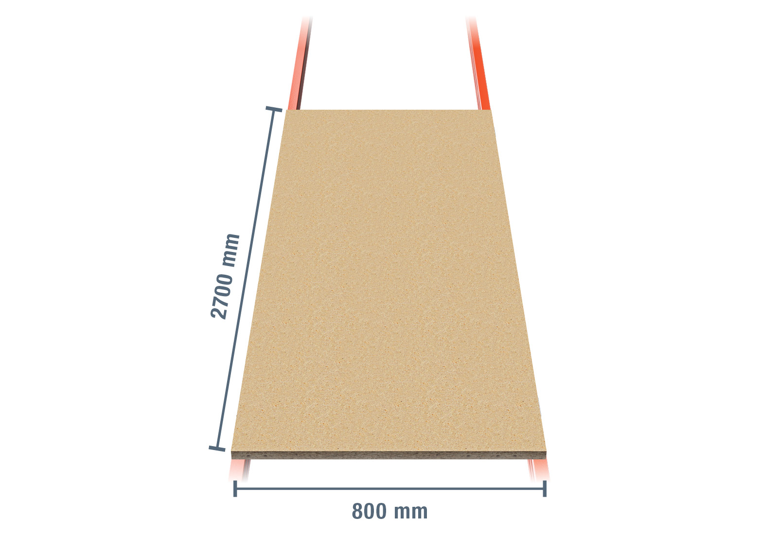 Med denne pallereoltræhylde kan du hurtigt og nemt tilføje ekstra opbevaringsplads i din TOPREGAL-pallereol, så selv opbevaring uden en palle er mulig. Den økonomiske træhylde er en 38 mm tyk spånplade med målene 2.700 mm x 800 mm og placeret på pallereolens traverser ved hjælp af 4 Z-vinkler.