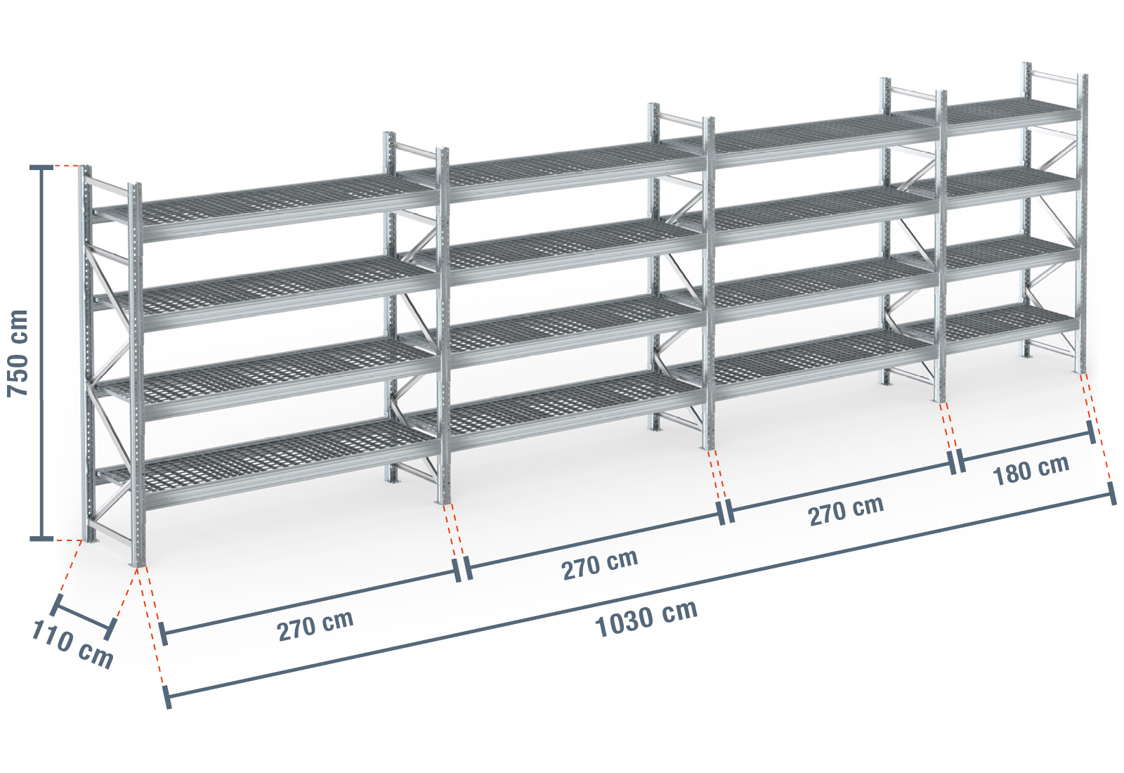 10,3 m pallereol PR9000F galvaniseret / 110 cm dyb / 7,5 m høj / 4 niveauer / hylder rist