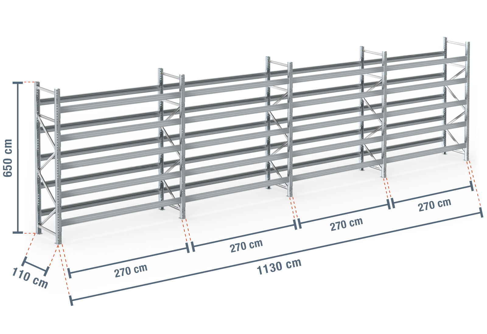 11,3 m pallereol PR9000F galvaniseret / 110 cm dyb / 6,5 m høj / 5 niveauer til 72 europaller
