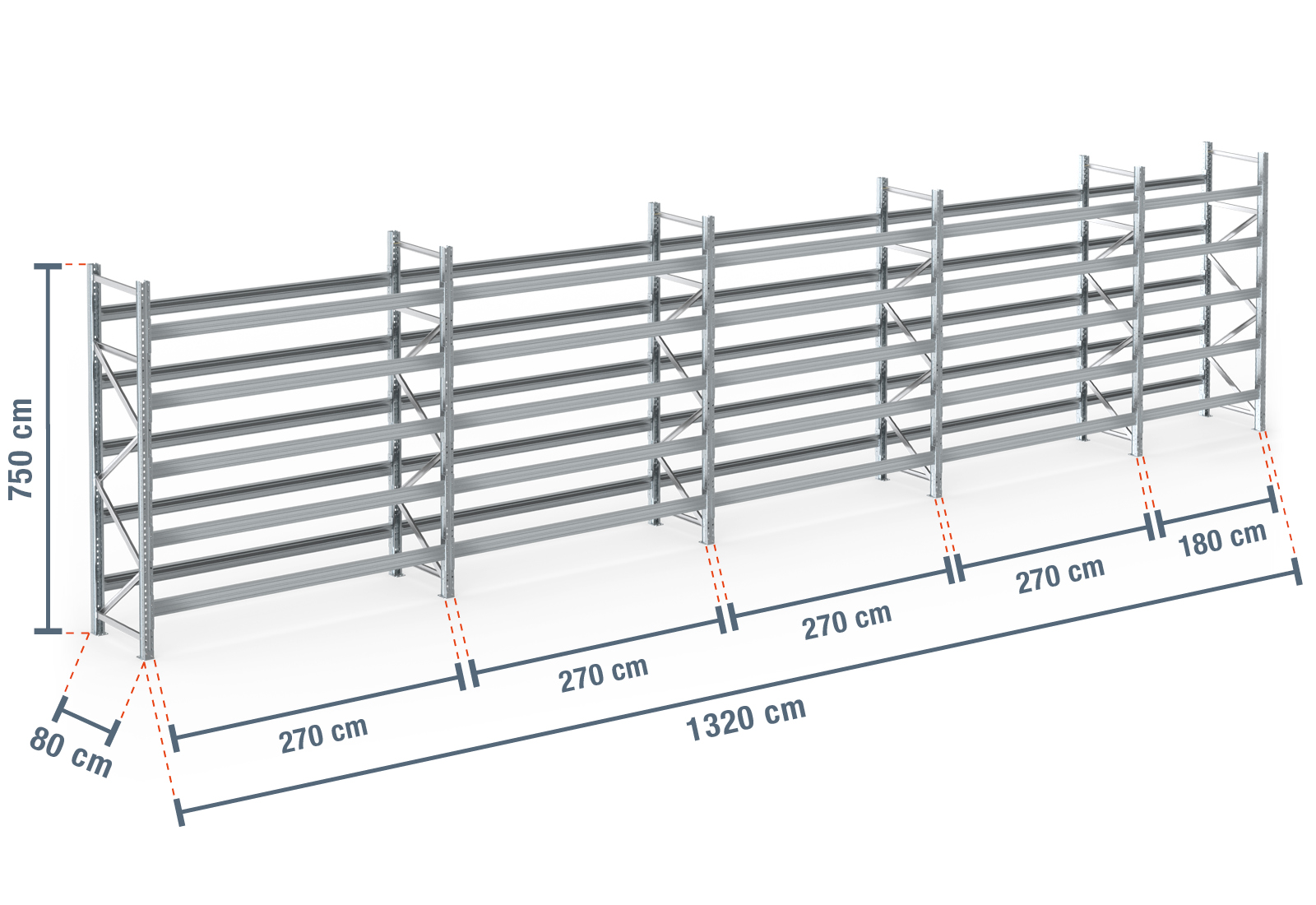 13,2 m pallereol PR9000F galvaniseret / 80 cm dyb / 7,5 m høj / 5 niveauer til 84 europaller