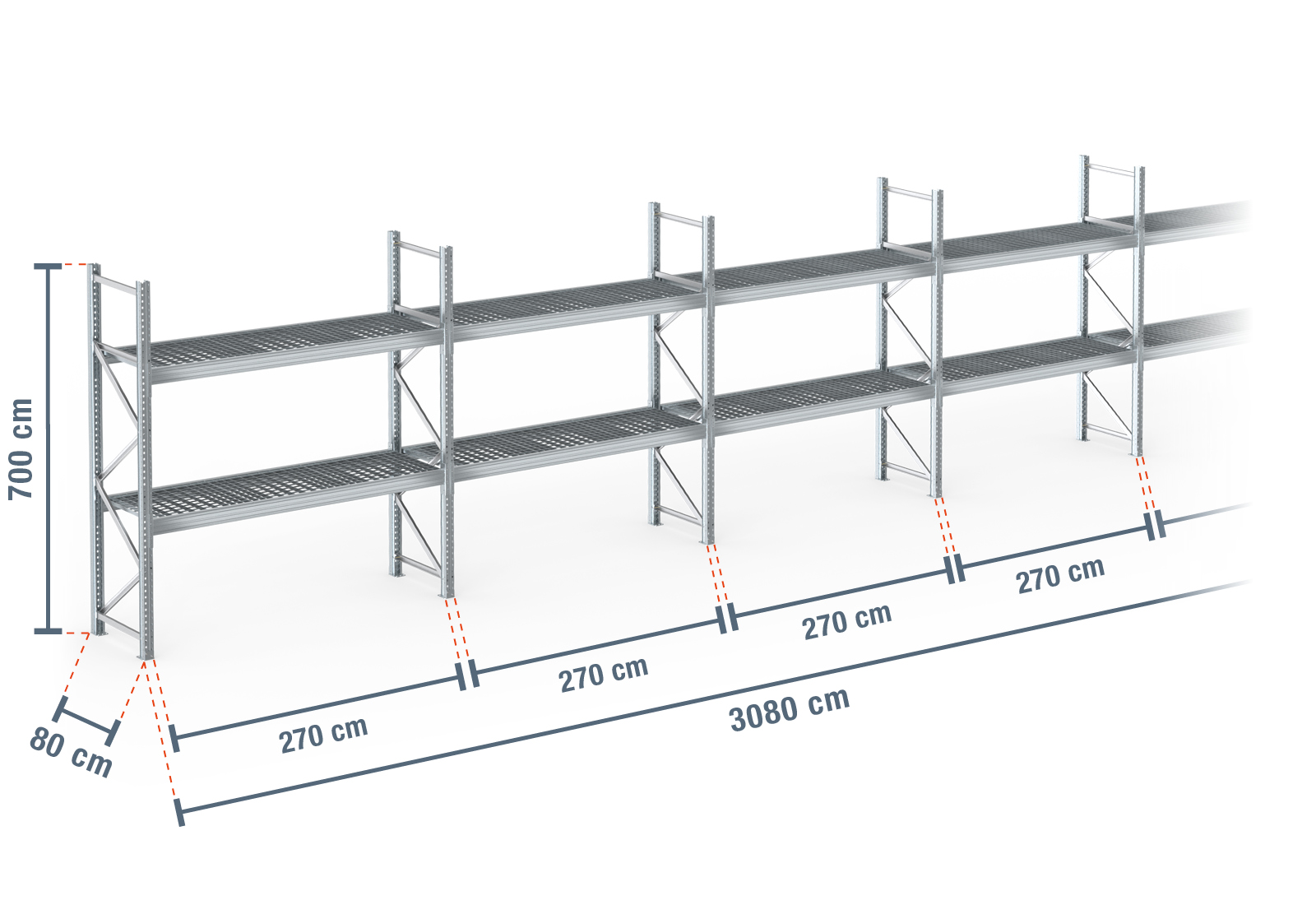 30,8 m pallereol PR9000F galvaniseret / 80 cm dyb / 7 m høj / 2 niveauer / hylder rist