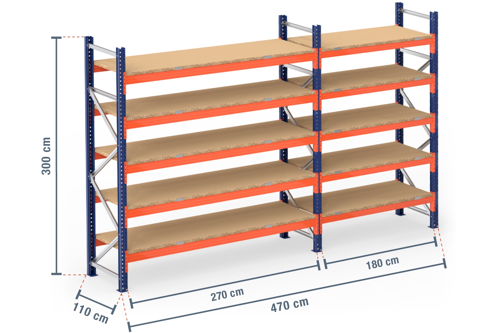4,7 m pallereol PR9000 / 110 cm dyb / 3 m høj / 5 niveauer / hylder træ