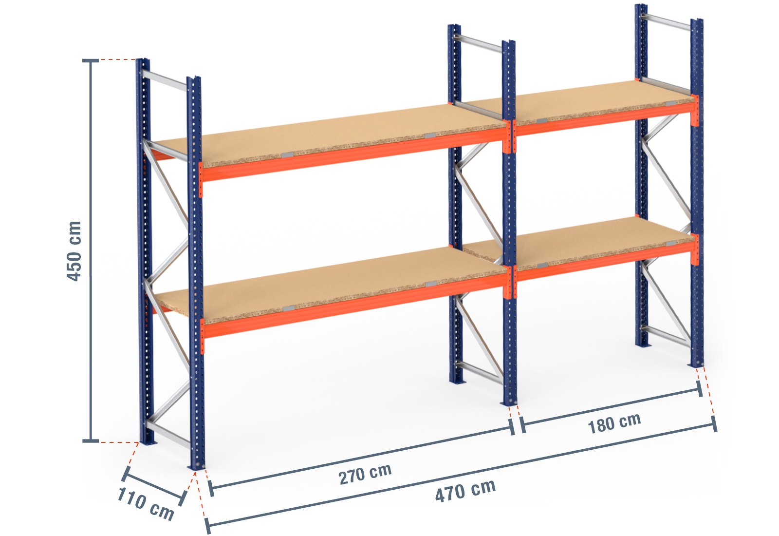 4,7 m pallereol PR9000 / 110 cm dyb / 4,5 m høj / 2 niveauer / hylder træ