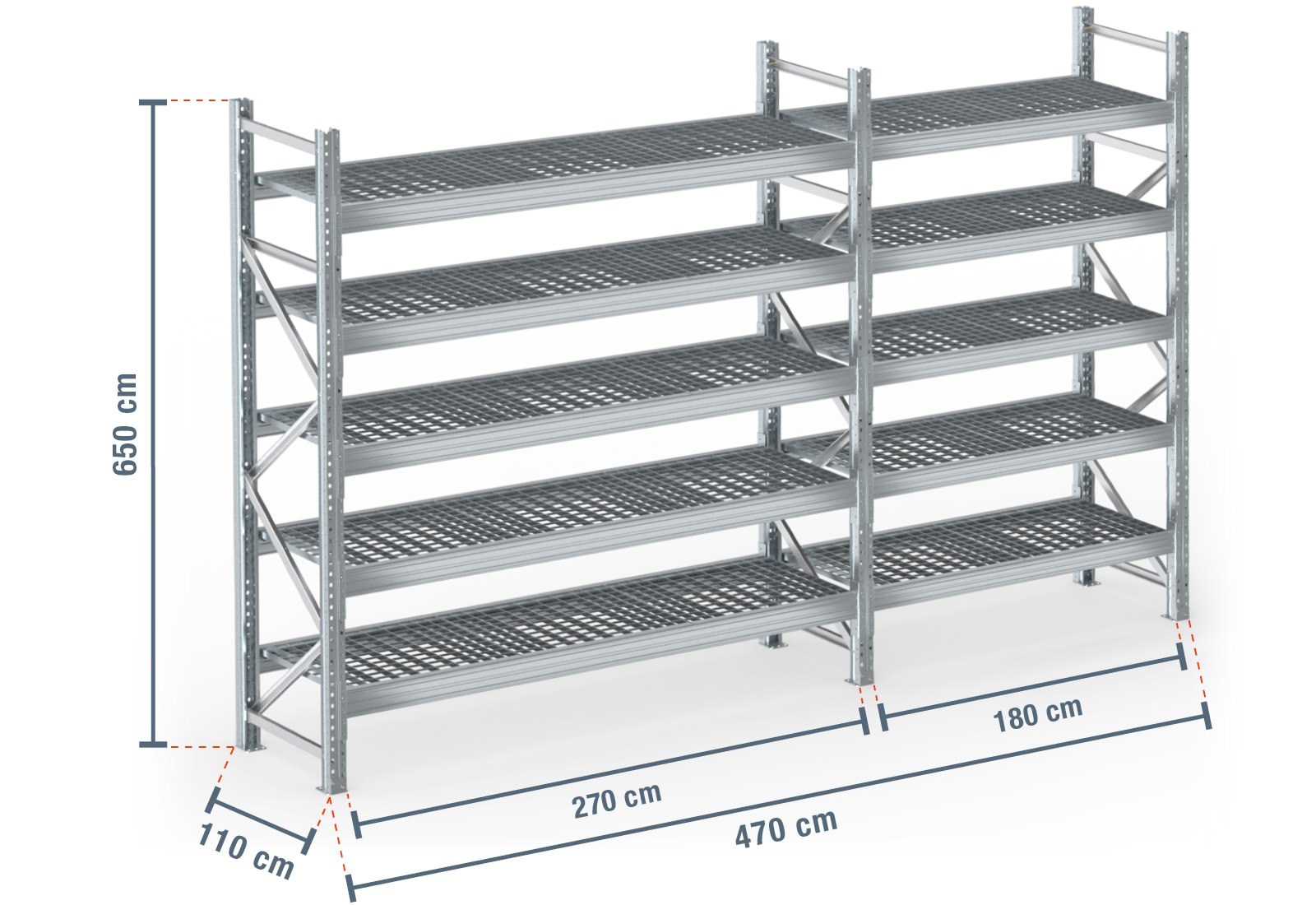 4,7 m pallereol PR9000F galvaniseret / 110 cm dyb / 6,5 m høj / 5 niveauer / hylder rist