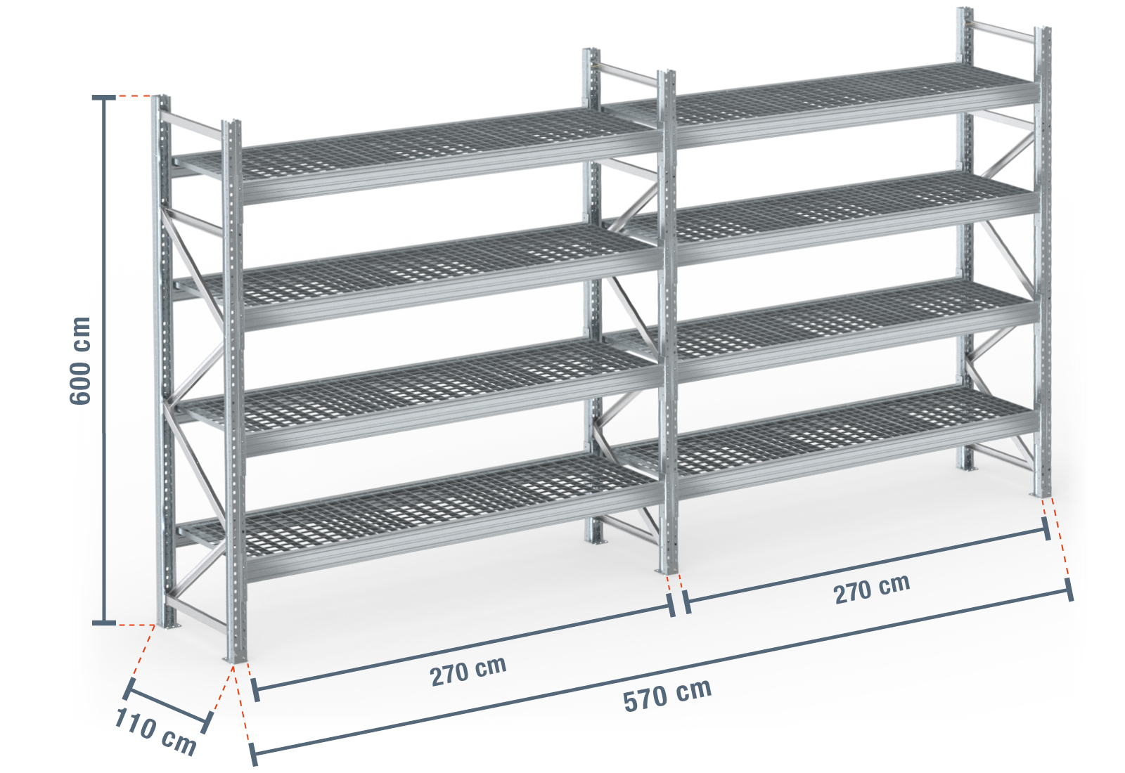 5,7 m pallereol PR9000F galvaniseret / 110 cm dyb / 6 m høj / 4 niveauer / hylder rist