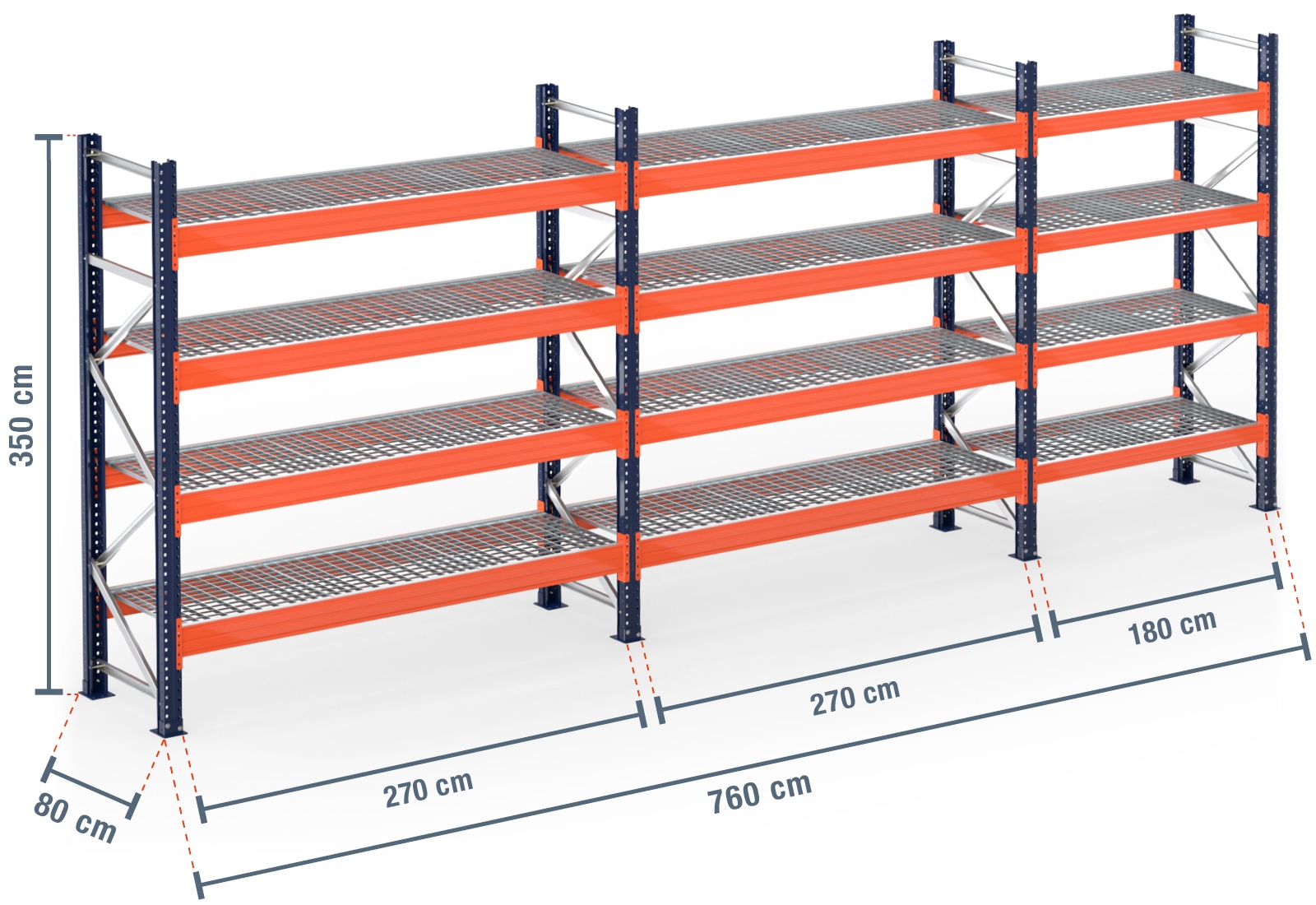 7,6 m pallereol PR15000 / 80 cm dyb / 3,5 m høj / 4 niveauer / hylder rist