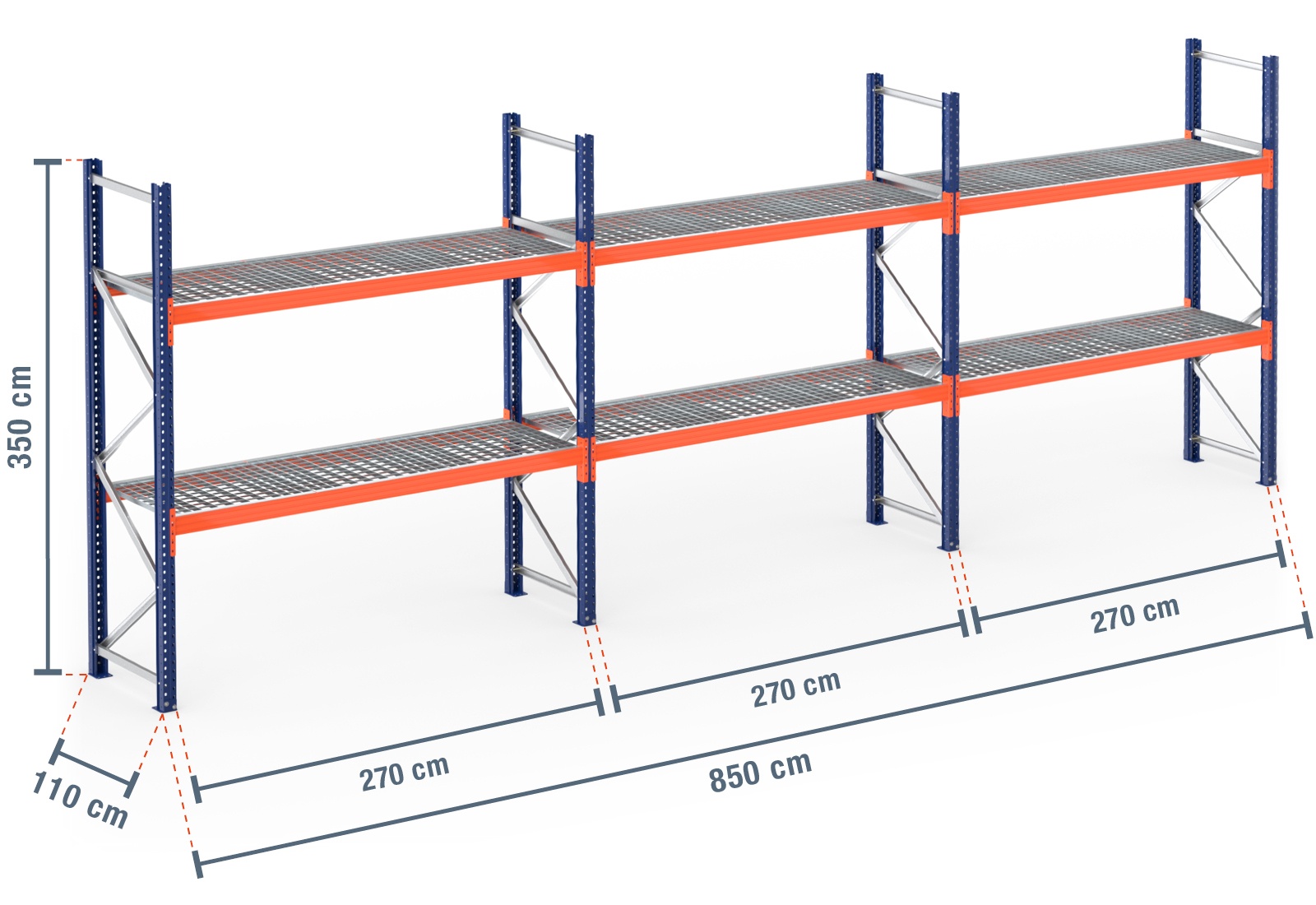 8,5 m pallereol PR9000 / 110 cm dyb / 3,5 m høj / 2 niveauer / hylder rist