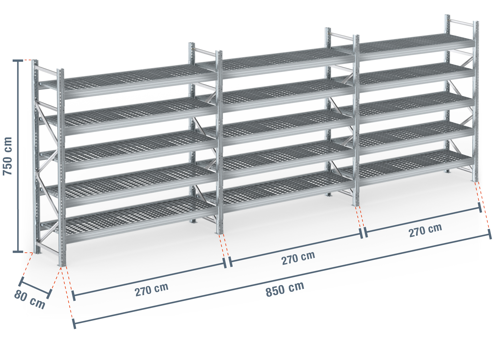 8,5 m pallereol PR9000F galvaniseret / 80 cm dyb / 7,5 m høj / 5 niveauer / hylder rist